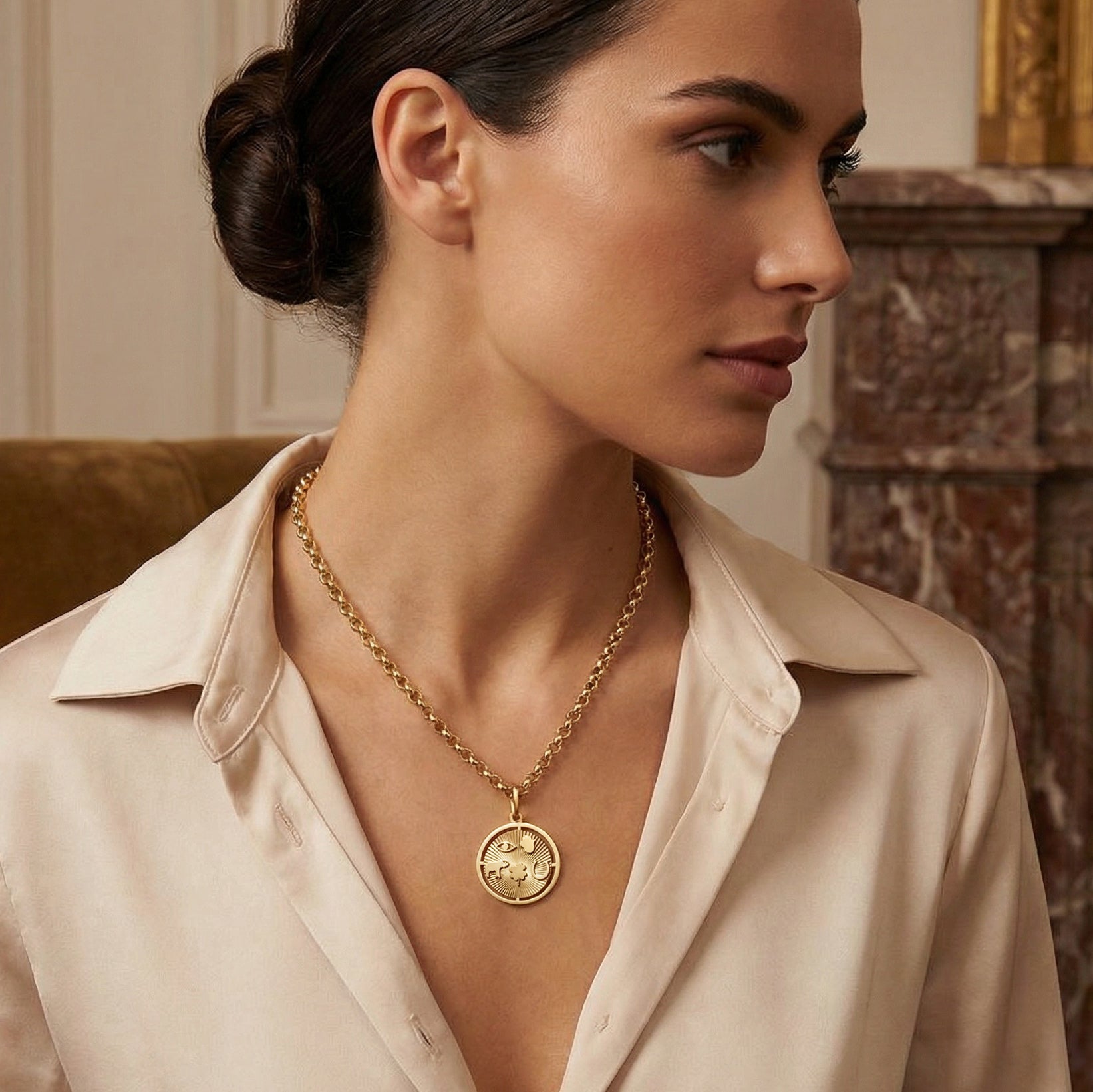 14K Gold Fluted Good Luck Hamsa Evil Eye Medallion Pendant