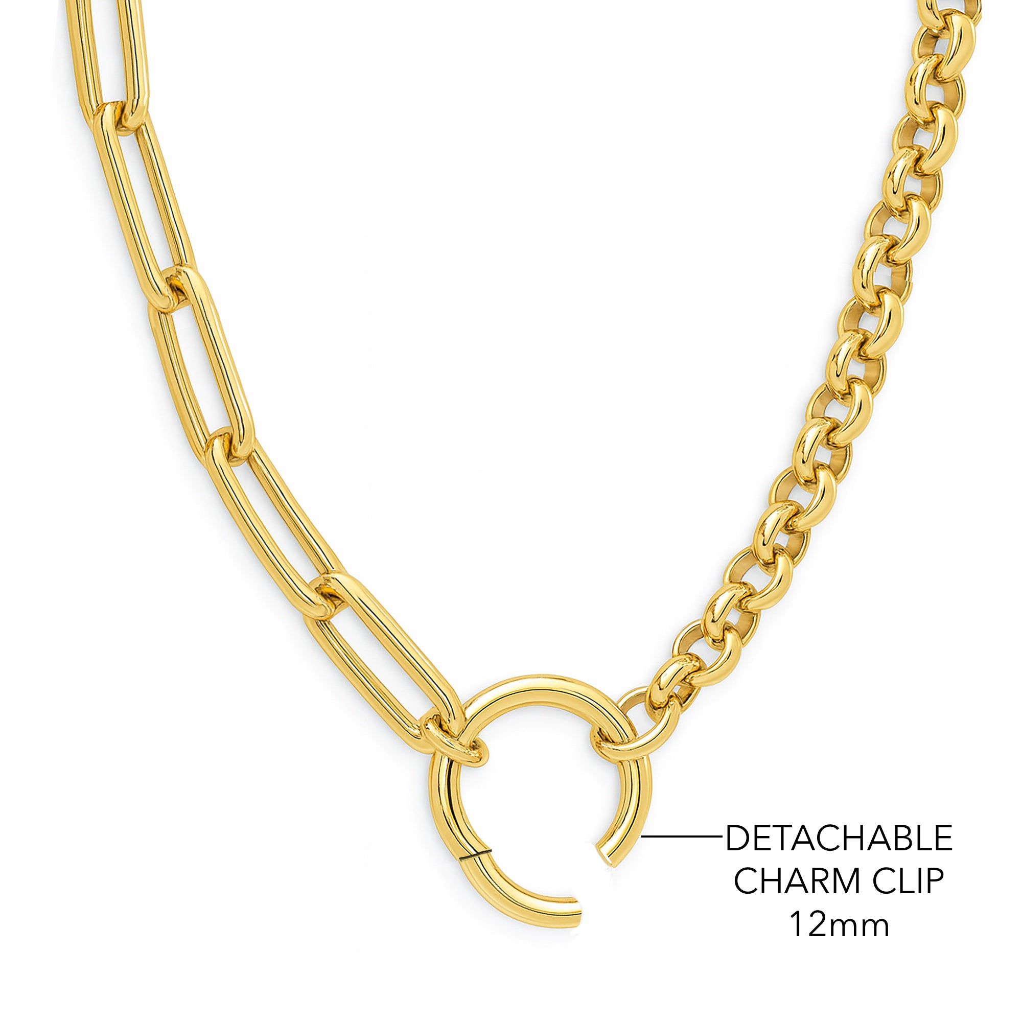 Introducing the 14K Gold Half Paperclip Half Cable Chain Necklace with Charm Clip, a unique and contemporary piece that effortlessly blends modern design elements. Crafted from high-quality 14-karat gold, this necklace showcases a captivating combination of half paperclip links and half cable chain, creating a distinctive and stylish accessory.