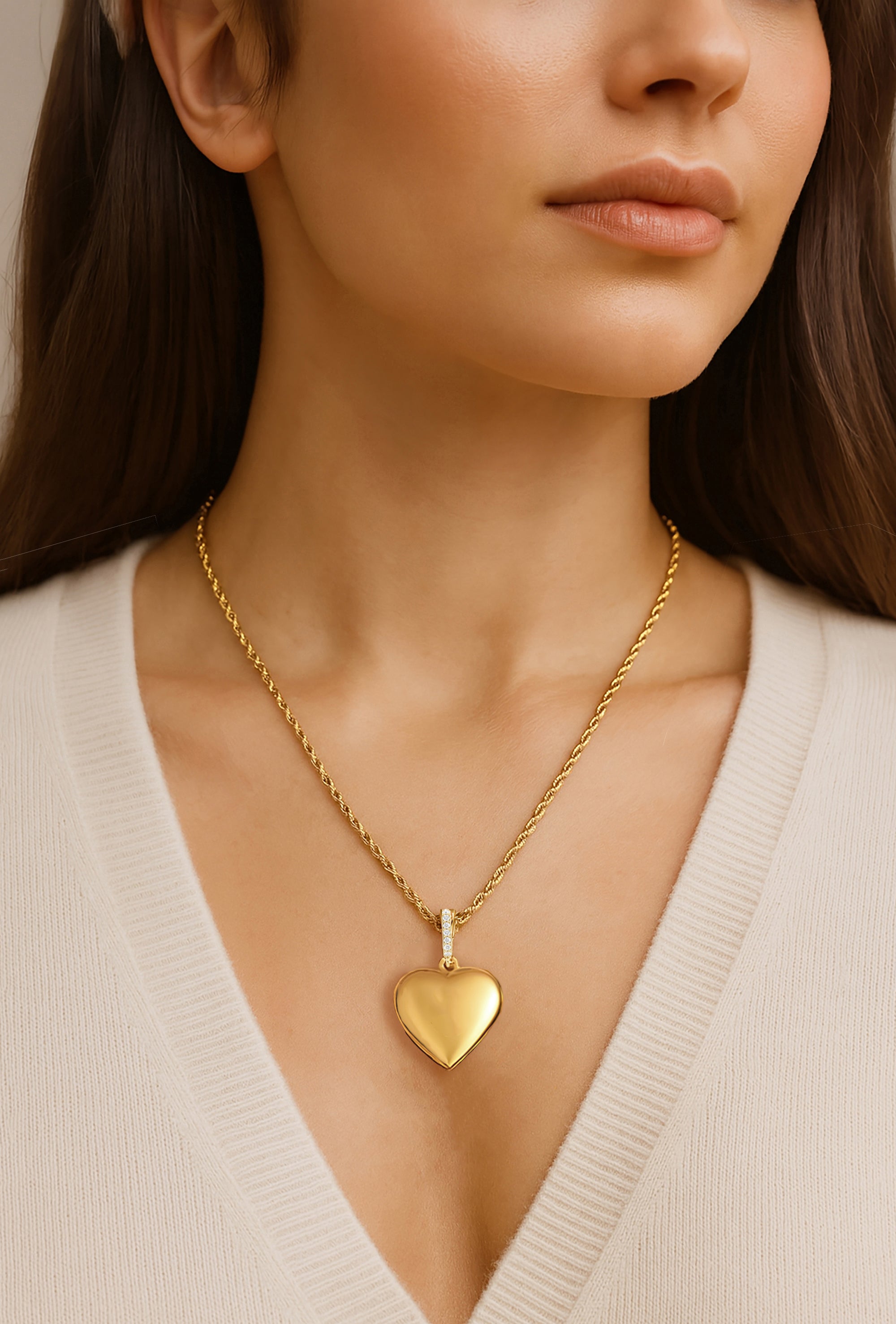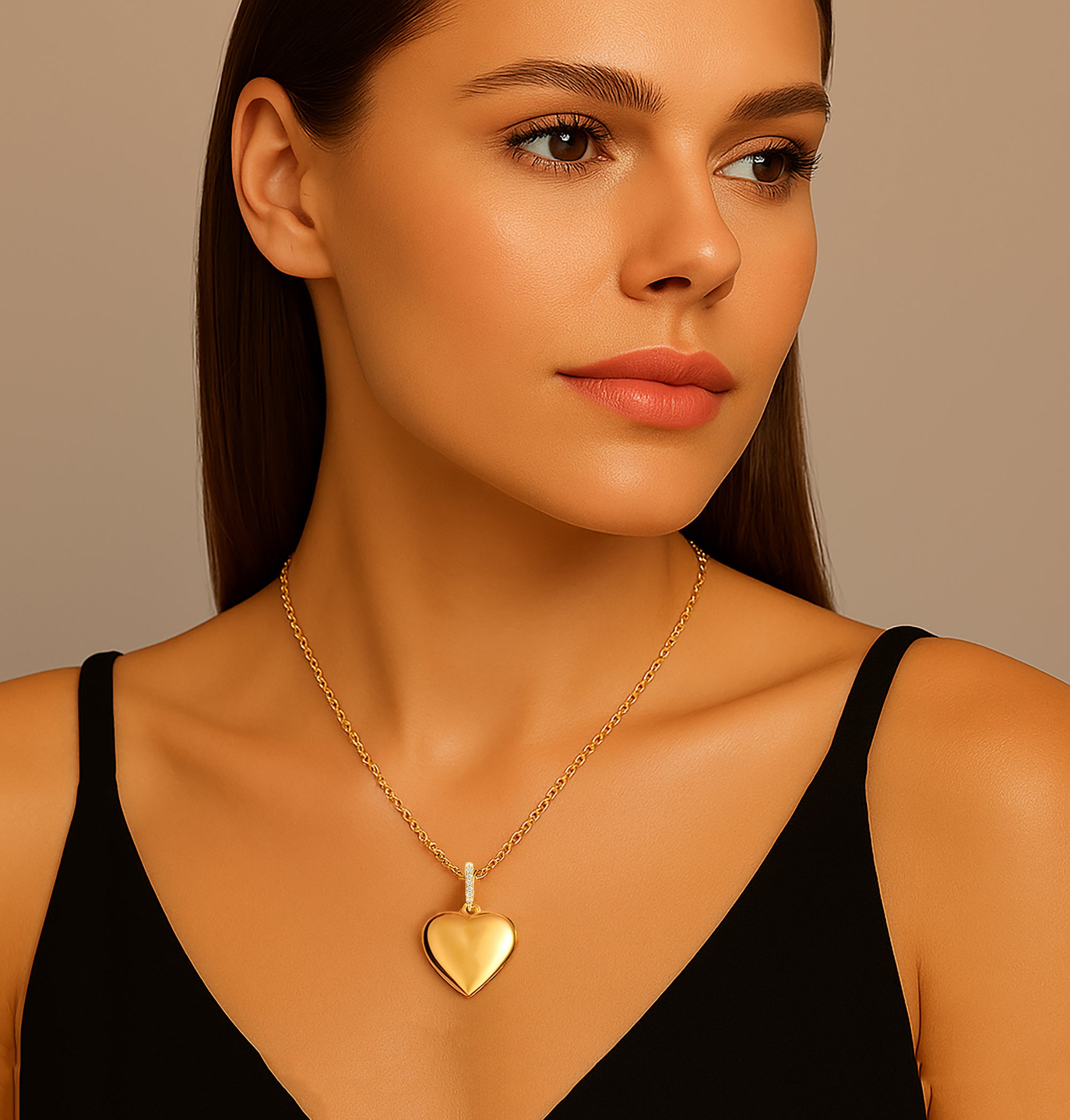 Choose from three bail options — a fixed diamond bail, a diamond enhancer bail that opens to fit multiple chains, or a classic plain bail for a sleek, minimalist look. The locket opens to hold two photos or keepsakes, and the back can be engraved with initials, names, or a special message, creating a truly personal heirloom.