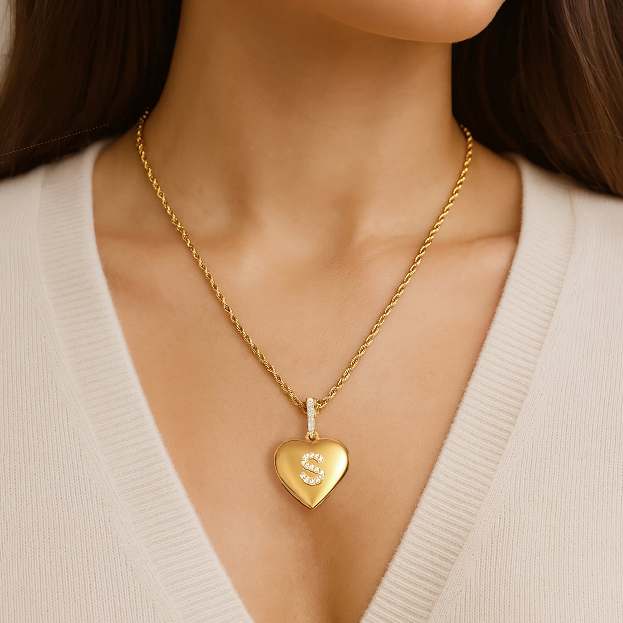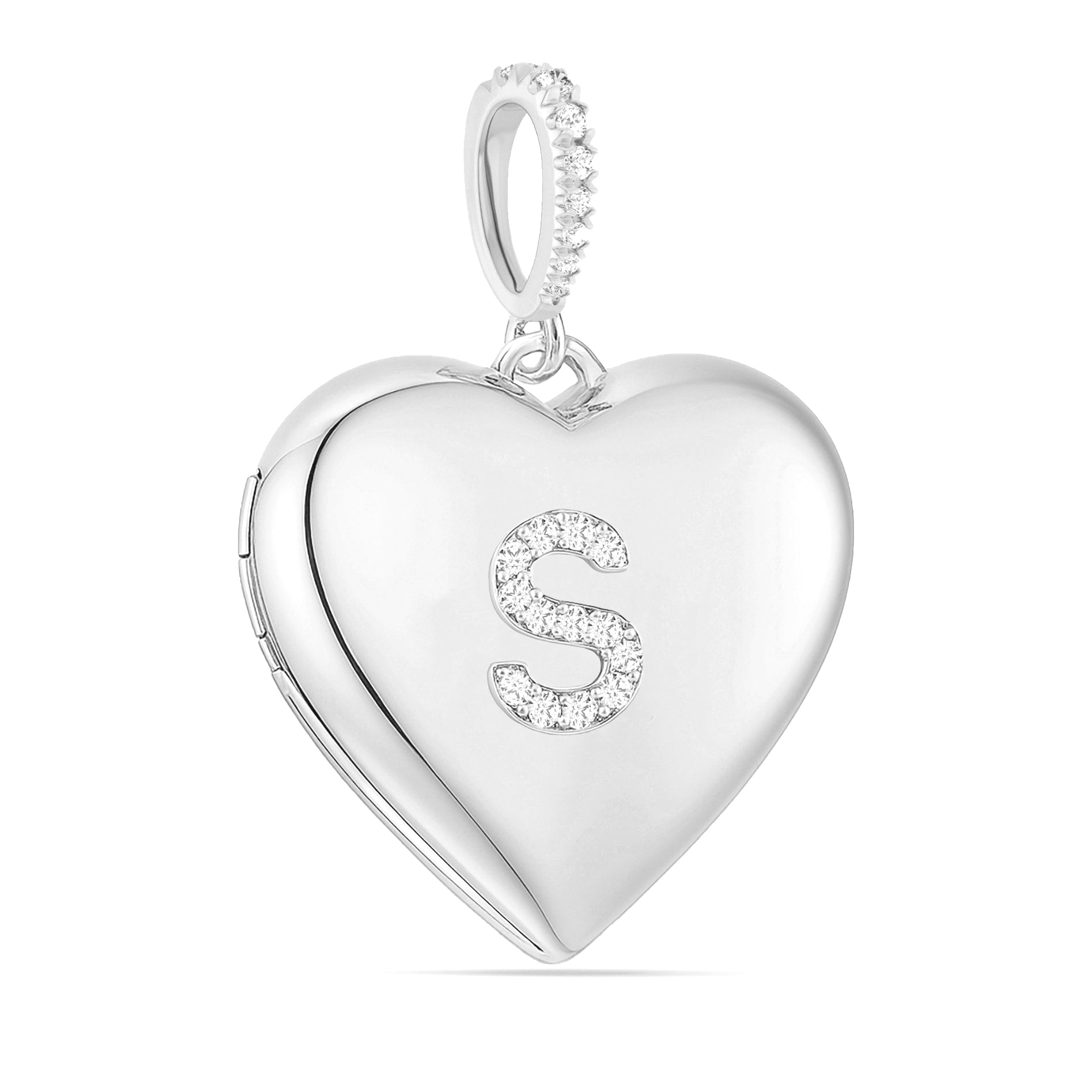 Choose from three bail options — a fixed diamond bail, a diamond enhancer bail that opens to fit multiple chains, or a classic plain bail for a sleek minimalist look. The locket opens to hold 2 photos or keepsakes, and the back can be engraved with initials, names, or a special message, creating a truly personal heirloom.