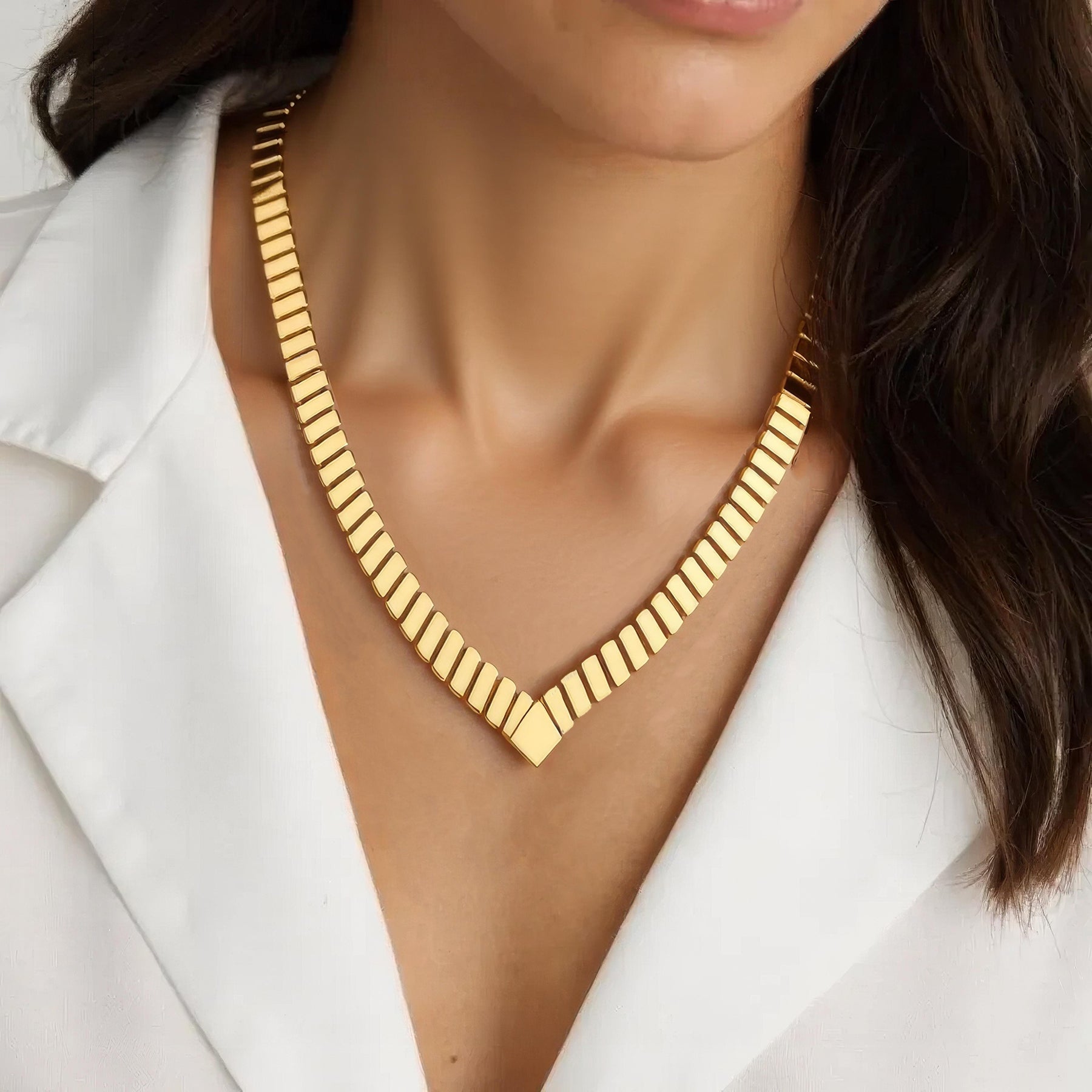 Experience true Italian luxury with our 14K Solid Gold Flat Bar Necklace — an iconic collar design handcrafted in Italy. Each polished bar link drapes elegantly along the neckline, creating a radiant V-shaped silhouette that feels both timeless and contemporary.