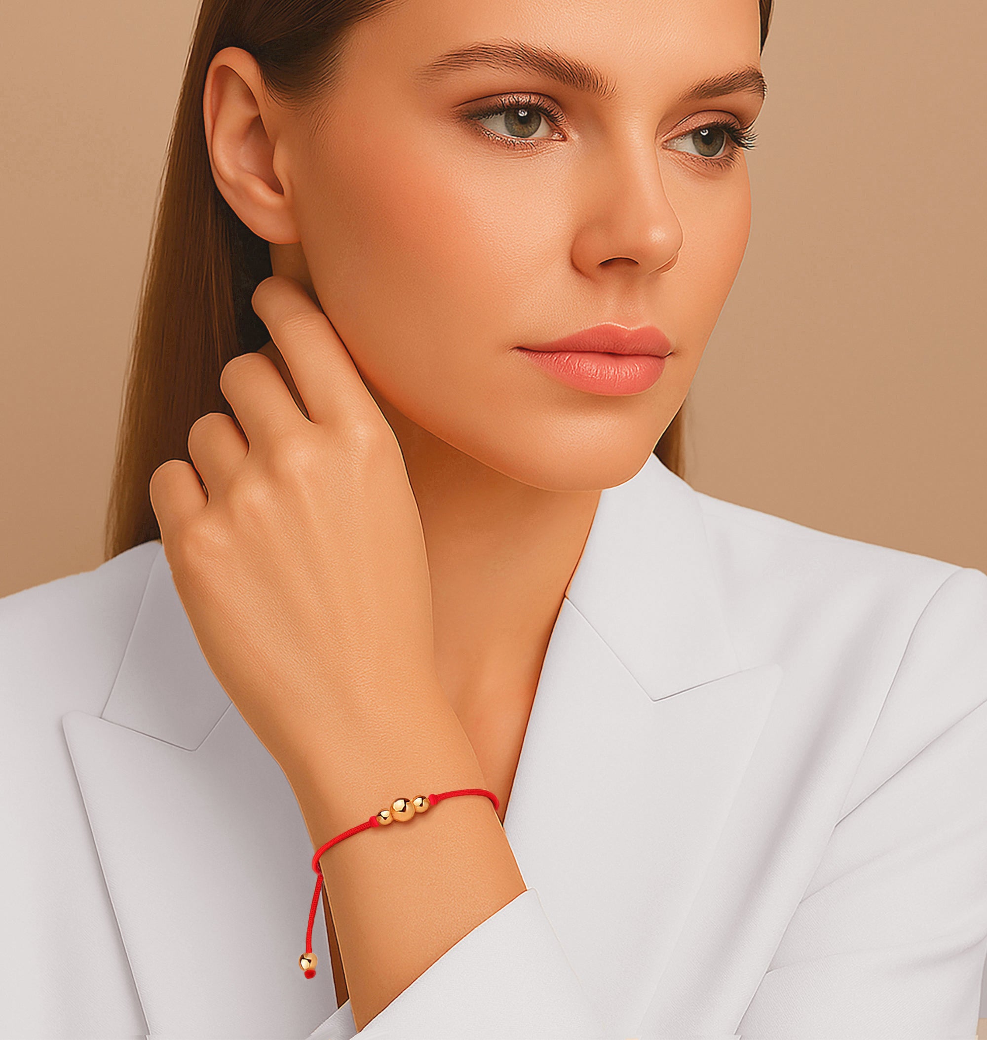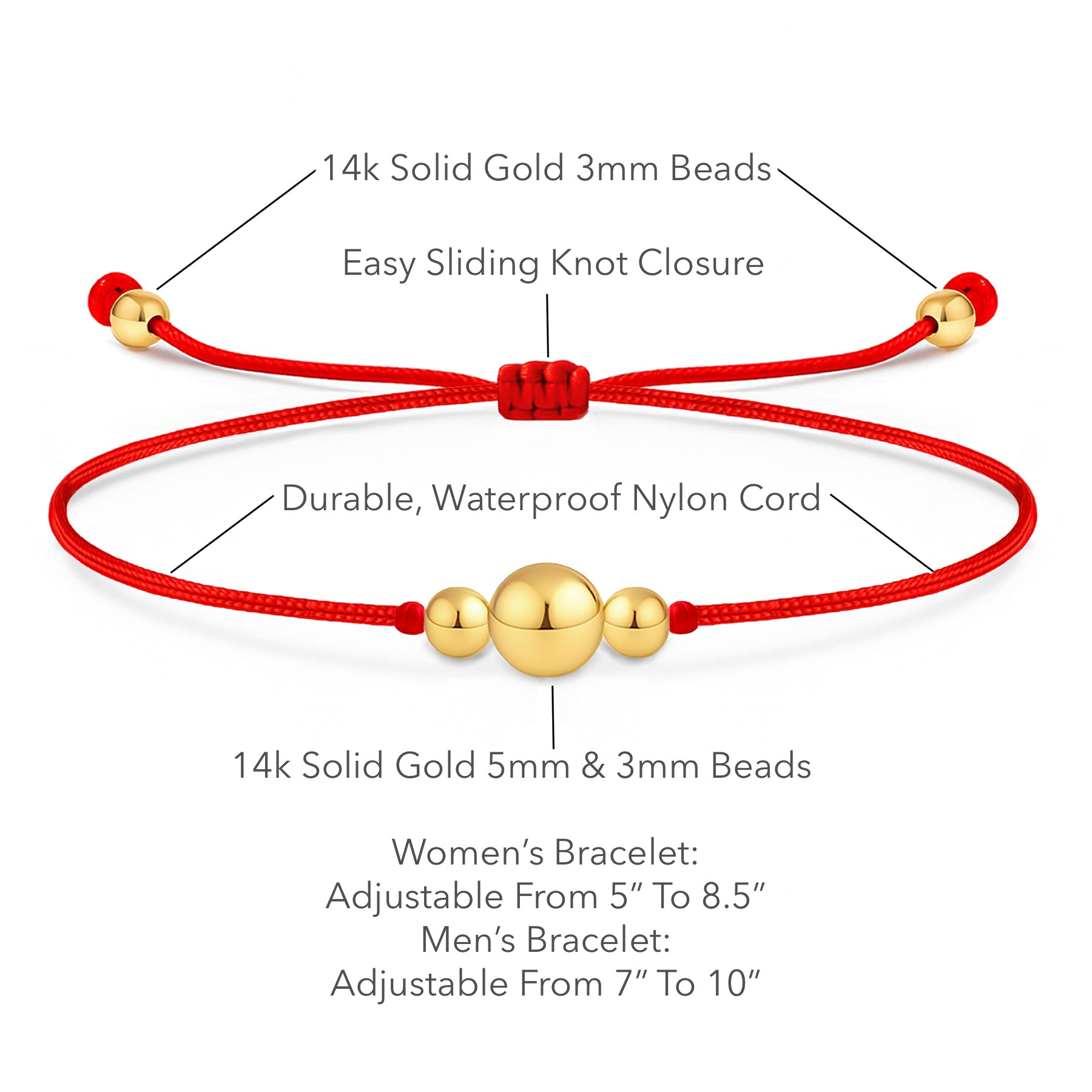 This elegant 14K solid gold red string bracelet, expertly crafted in the USA, features genuine gold beads delicately threaded on a sturdy red cord. Inspired by Kabbalah traditions, it embodies protection, faith, and good luck with a modern design. Resistant to water and tarnish, it’s built for durability, letting you wear it while swimming or showering. The vivid cord beautifully complements the radiant 14K yellow gold beads, making it a versatile piece for both casual and formal occasions. A timeless accessory that combines spiritual meaning with refined sophistication.