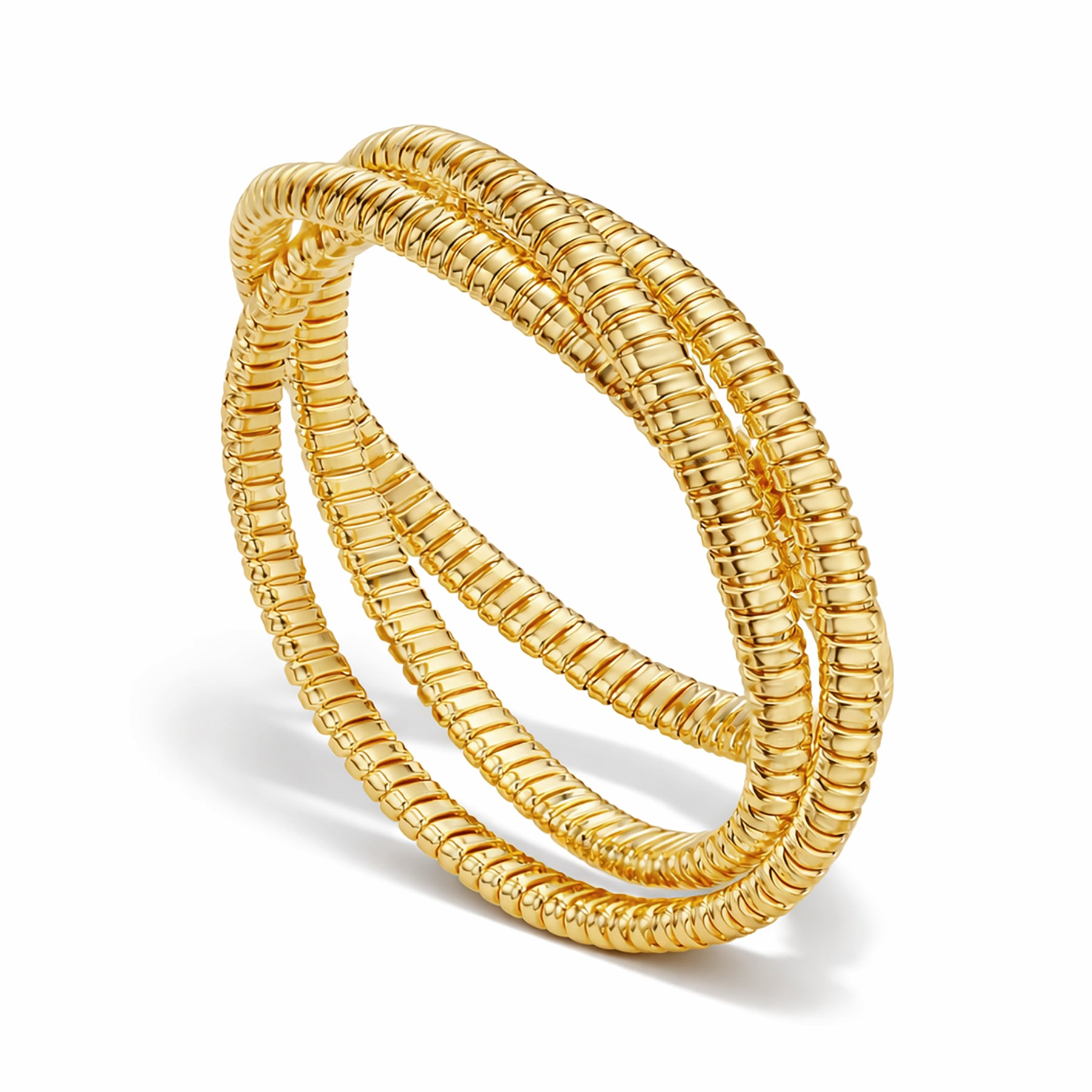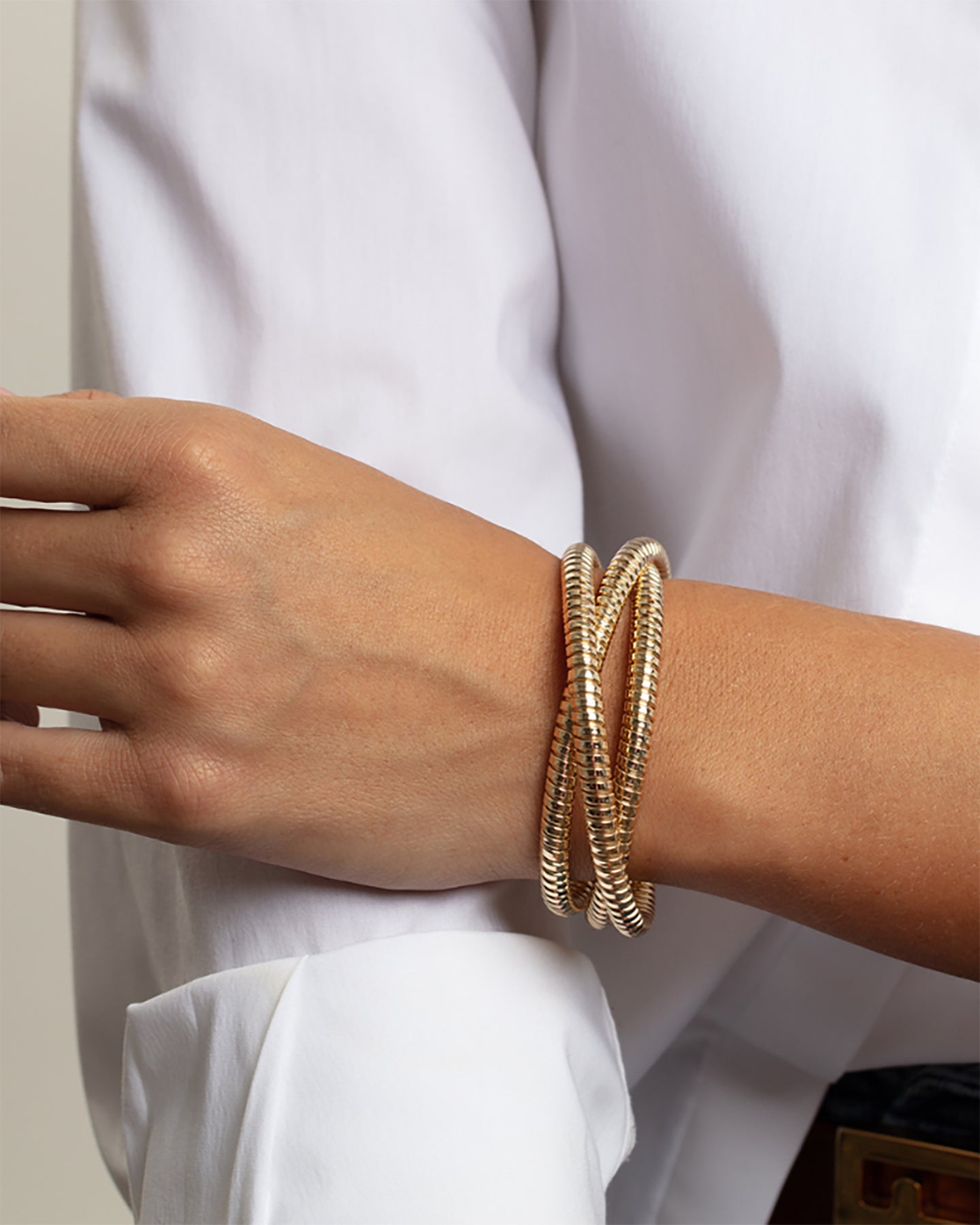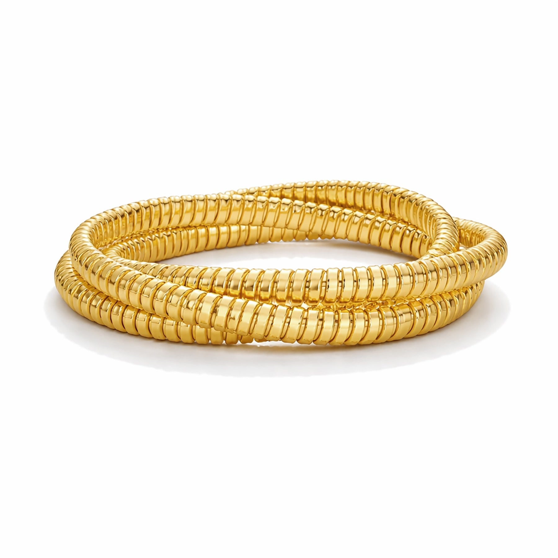 Introducing our triple Tubogas Bracelet, a bold and luxurious accessory that exudes sophistication and modernity. This bracelet is meticulously crafted from high-quality 14kt gold, ensuring both durability and a radiant, timeless allure.