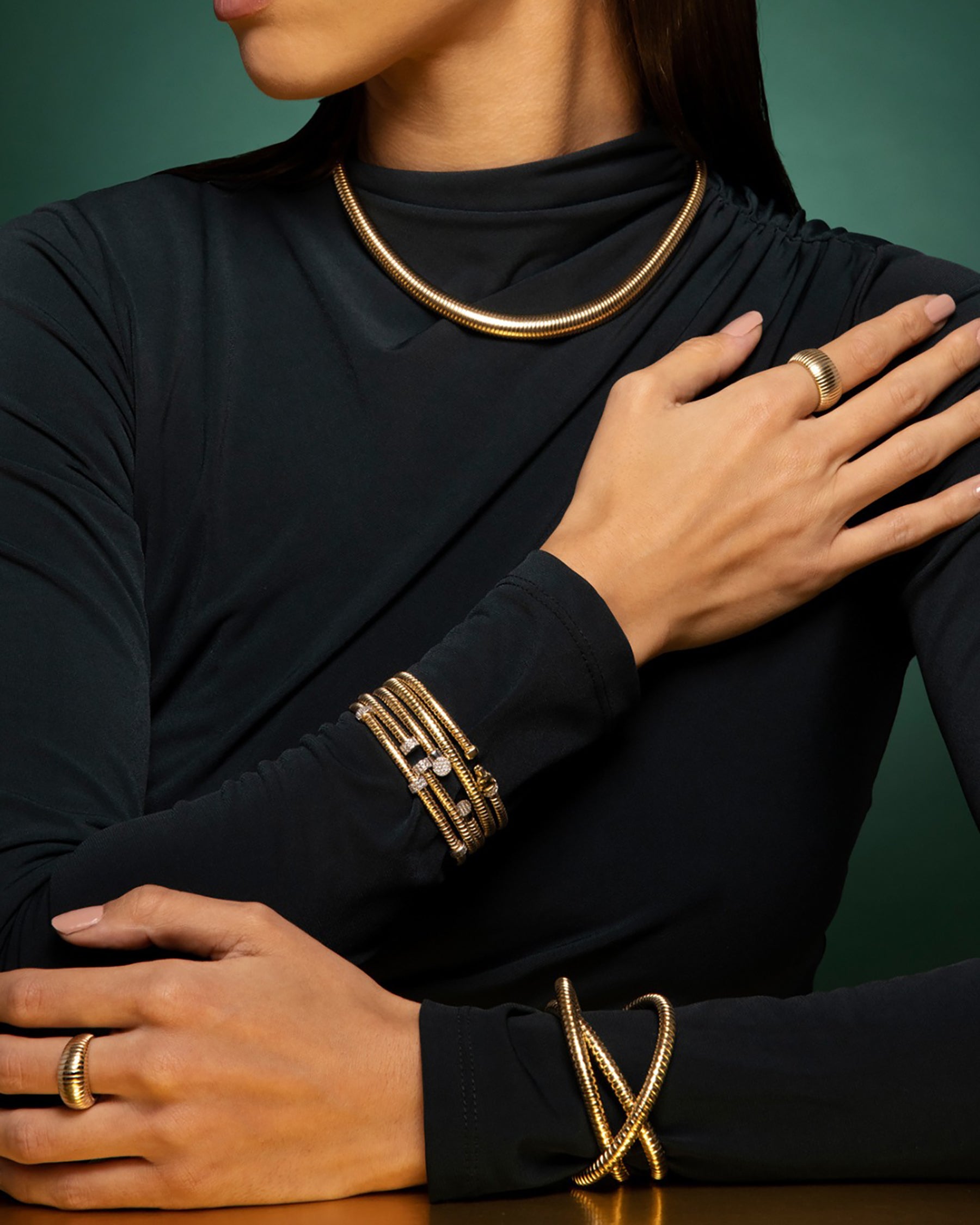 The Tubogas design, characterized by coiled and interlocking gold bands, creates a distinctive and eye-catching pattern that adds a touch of drama to the bracelet.