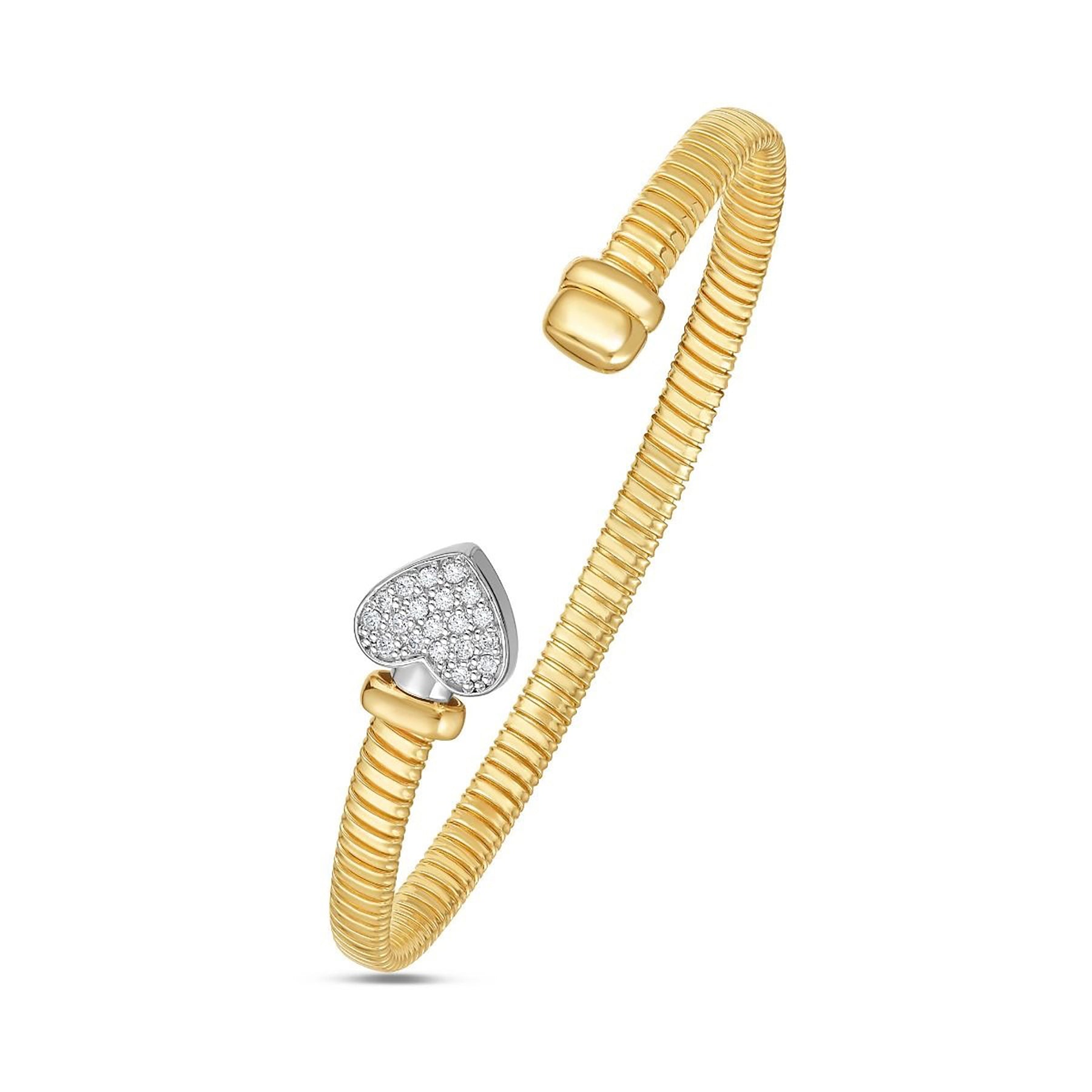 Crafted in solid 14K yellow gold, this elegant Diamond Tubogas Bracelet features a flexible coil cuff design that wraps comfortably around the wrist. The polished Italian-inspired tubogas construction is accented with a sparkling diamond heart centerpiece, blending romance with modern luxury.