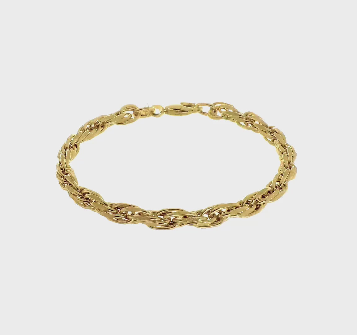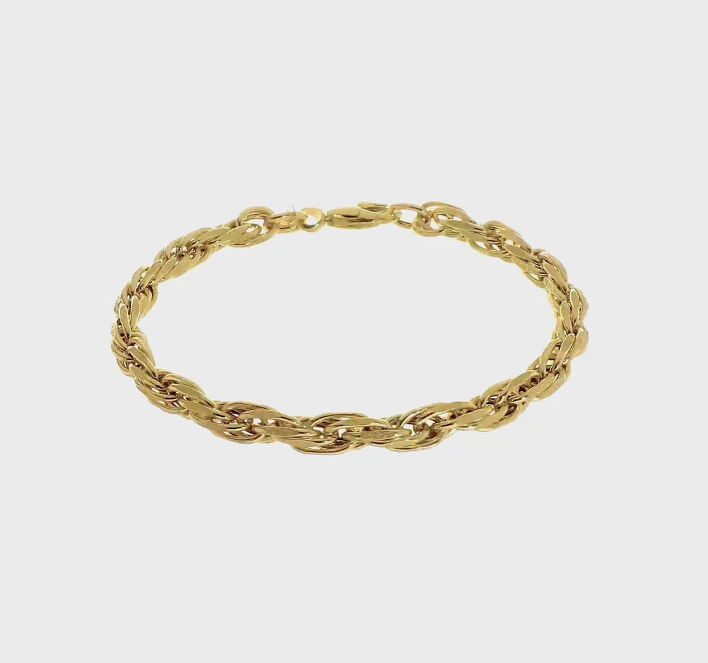 This 14K solid gold rope chain bracelet is expertly crafted in Italy, showcasing timeless design and exceptional craftsmanship. Featuring an intricate twisted rope pattern with a high-polish finish, this bracelet reflects light beautifully while offering durability for everyday wear.