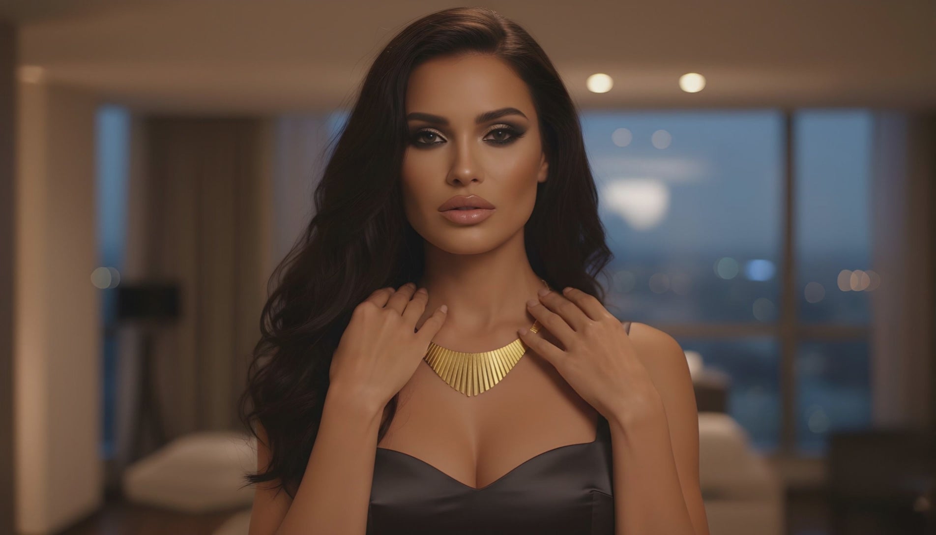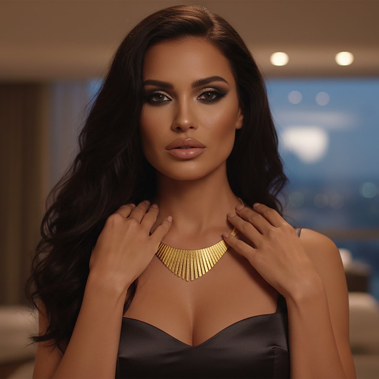 This luxurious necklace combines timeless artistry with modern sophistication — featuring a tapered omega design that gracefully contours the neckline. Each link alternates between polished and textured finishes, creating a radiant play of light that evokes the glamour of Cleopatra herself.