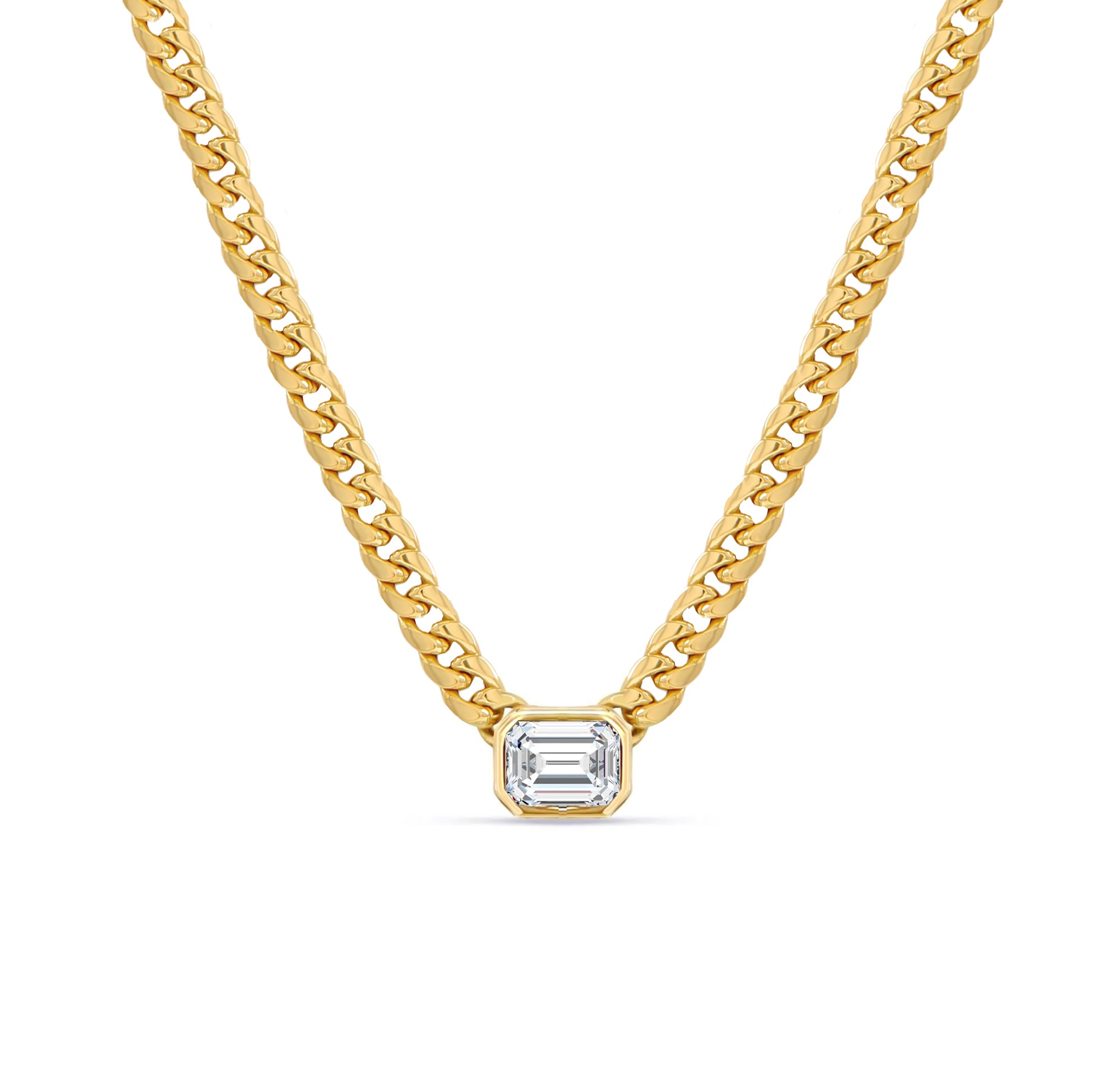 14k Gold Cuban Link Chain Necklace with Bezel Setting Emerald Cut Diamond