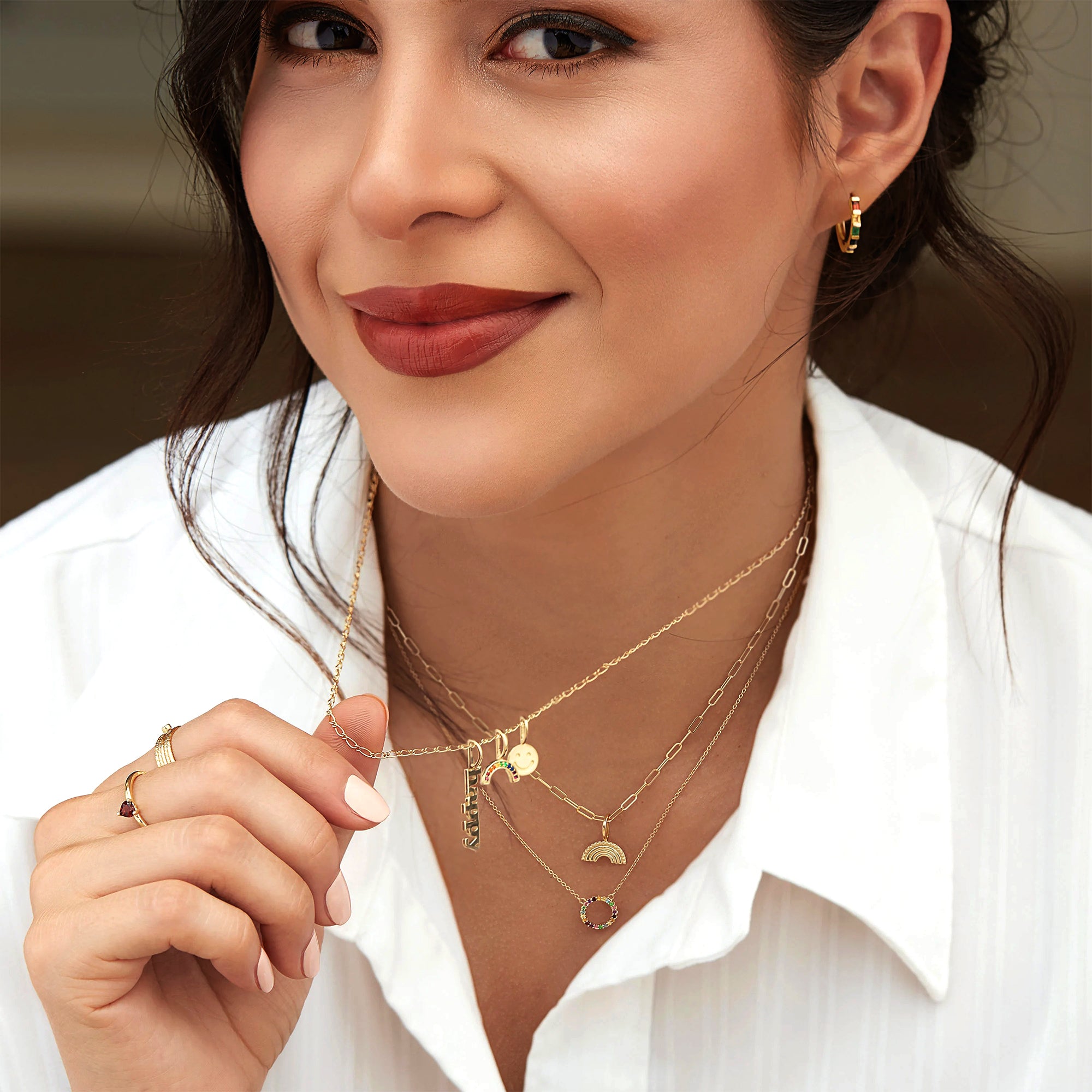 Bring a pop of color and joy to your jewelry collection with this 14K Gold Rainbow Charm Pendant. Handcrafted in solid 14K gold, this dainty charm features a vibrant arc of multi-colored gemstones that capture the beauty of a rainbow. Perfect for layering on your favorite chain or adding to a charm bracelet, this piece is a symbol of hope, positivity, and timeless style. A meaningful gift for yourself or someone special who loves color and elegance.