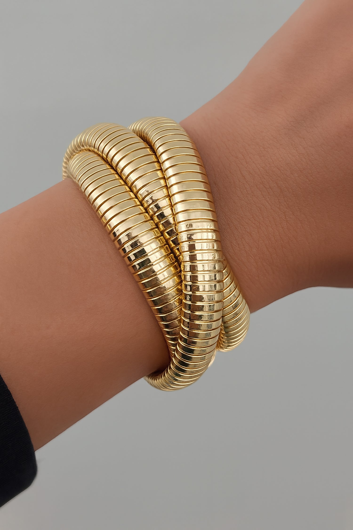 Introducing our triple Tubogas Bracelet, a bold and luxurious accessory that exudes sophistication and modernity. This bracelet is meticulously crafted from high-quality 14 or 18-karat gold, ensuring both durability and a radiant, timeless allure. Experience the elegance of Italian craftsmanship with this stunning bracelet.Ā