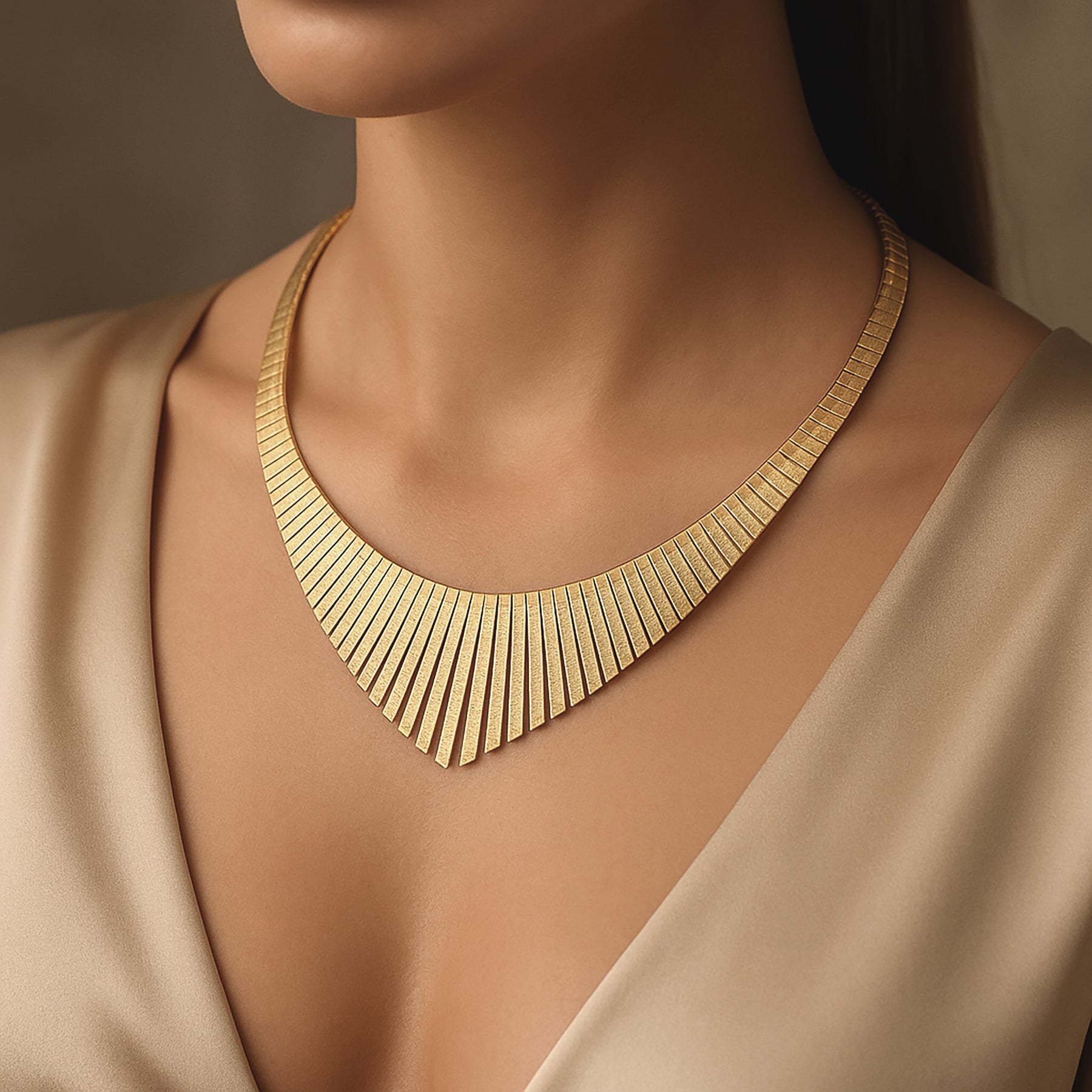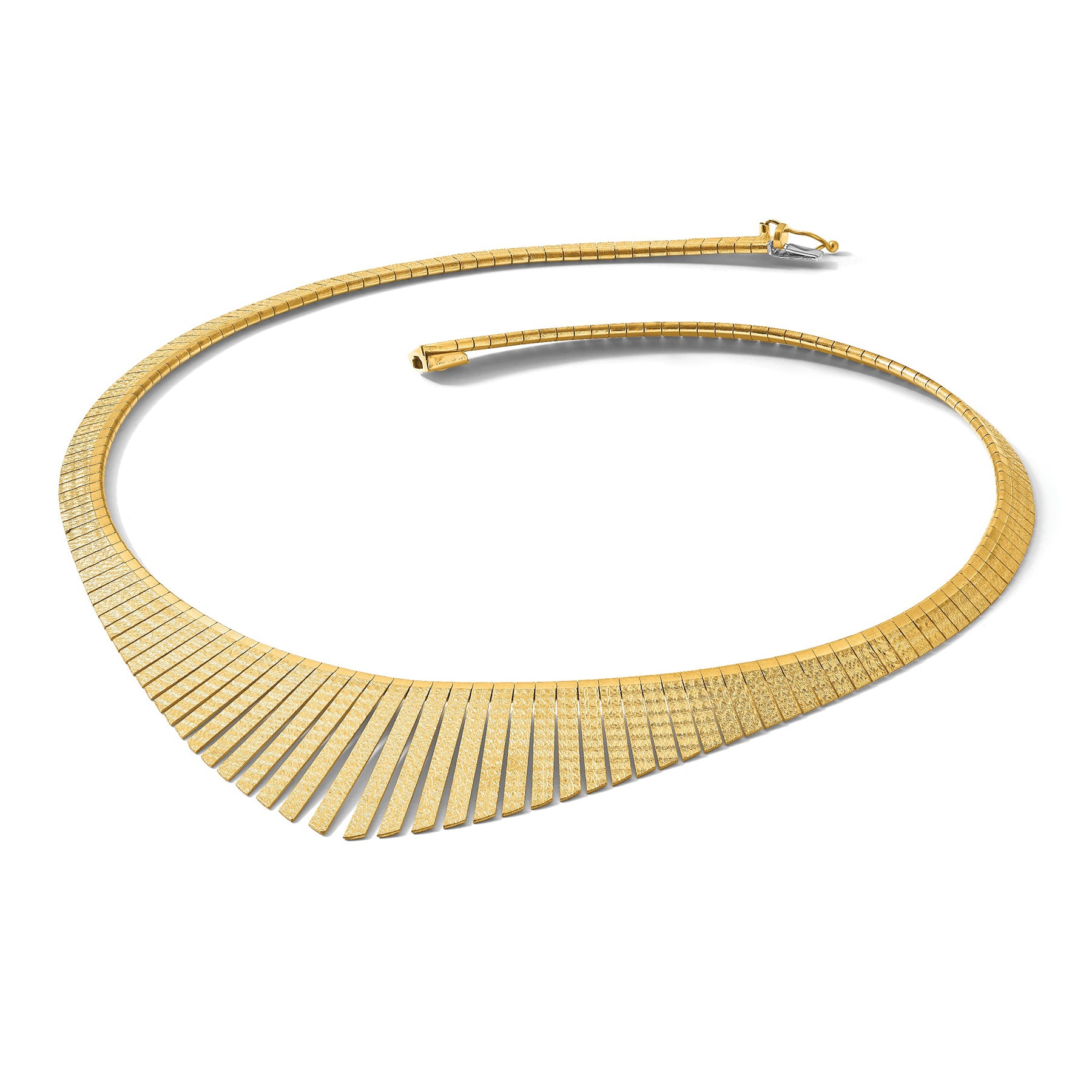 This luxurious necklace combines timeless artistry with modern sophistication — featuring a tapered omega design that gracefully contours the neckline. Each link alternates between polished and textured finishes, creating a radiant play of light that evokes the glamour of Cleopatra herself.
