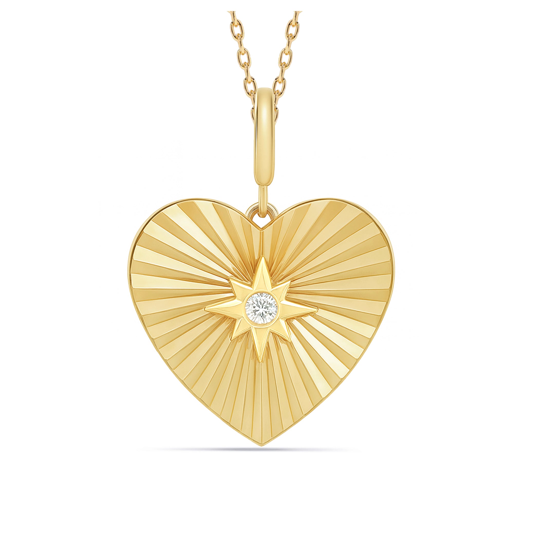 Celebrate love and light with this 14K solid gold fluted heart necklace, accented with a brilliant North Star design set with AAA premium cubic zirconia. The radiant, sunburst-inspired texture reflects light from every angle, symbolizing guidance, hope, and enduring love.