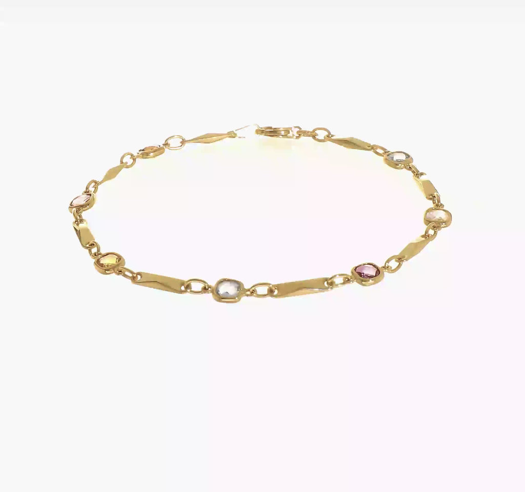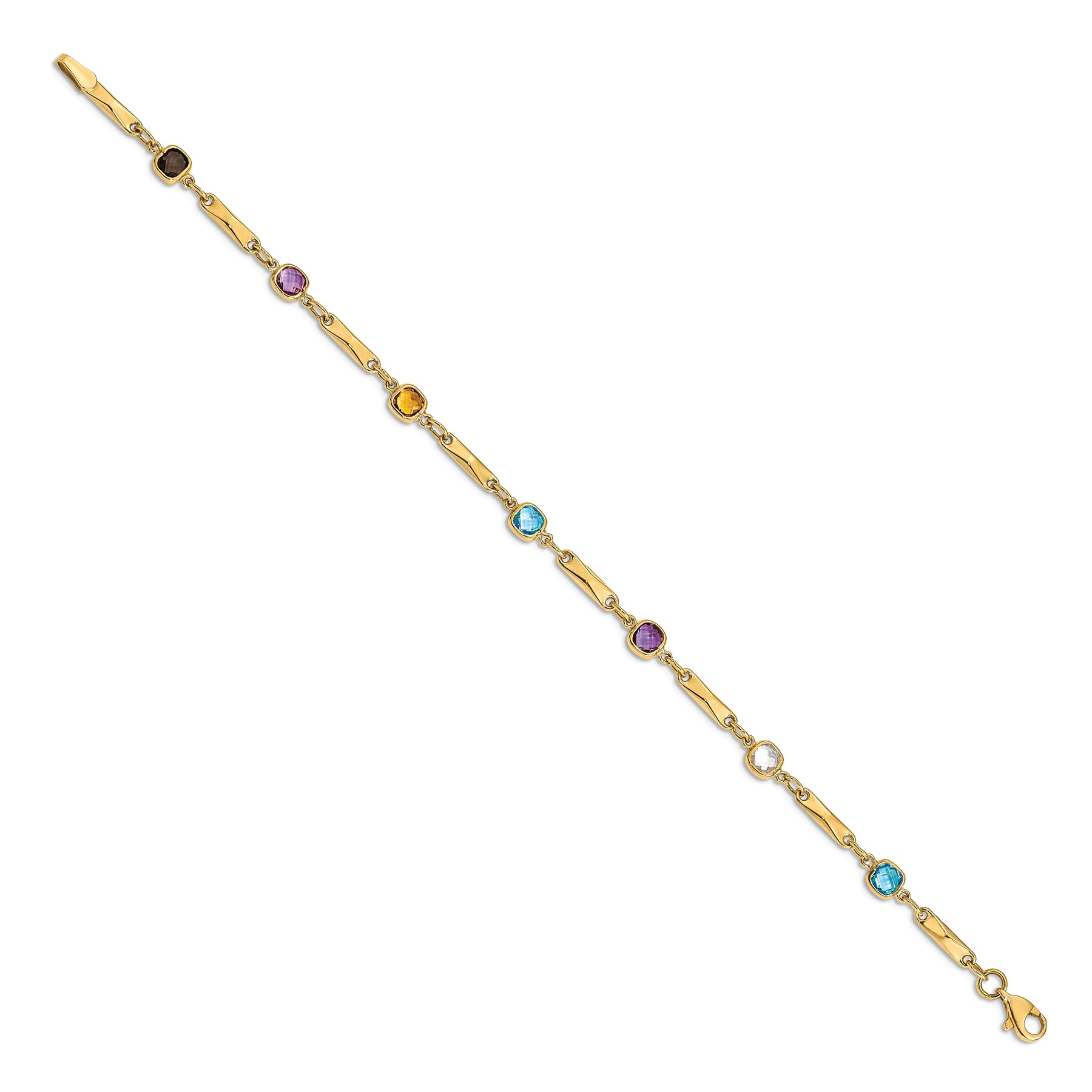 Experience the beauty of color and craftsmanship with this 14K Solid Gold Rainbow Gemstone Bracelet, meticulously made in Italy. Featuring a vibrant mix of genuine Sky Blue Topaz, Citrine, Amethyst,White Quartz and Smoky Quartz, each bezel-set stone is linked with polished 14K gold geometric bars for a modern, luxurious finish. Lightweight, elegant, and eye-catching, this bracelet adds the perfect pop of color to any stack or can be worn alone as a refined statement piece. A timeless gift for birthdays, anniversaries, and gemstone lovers.