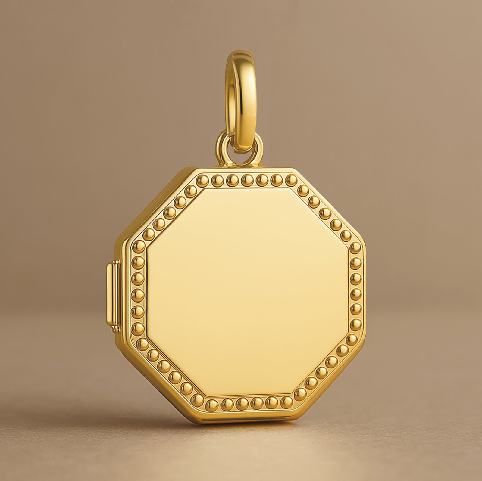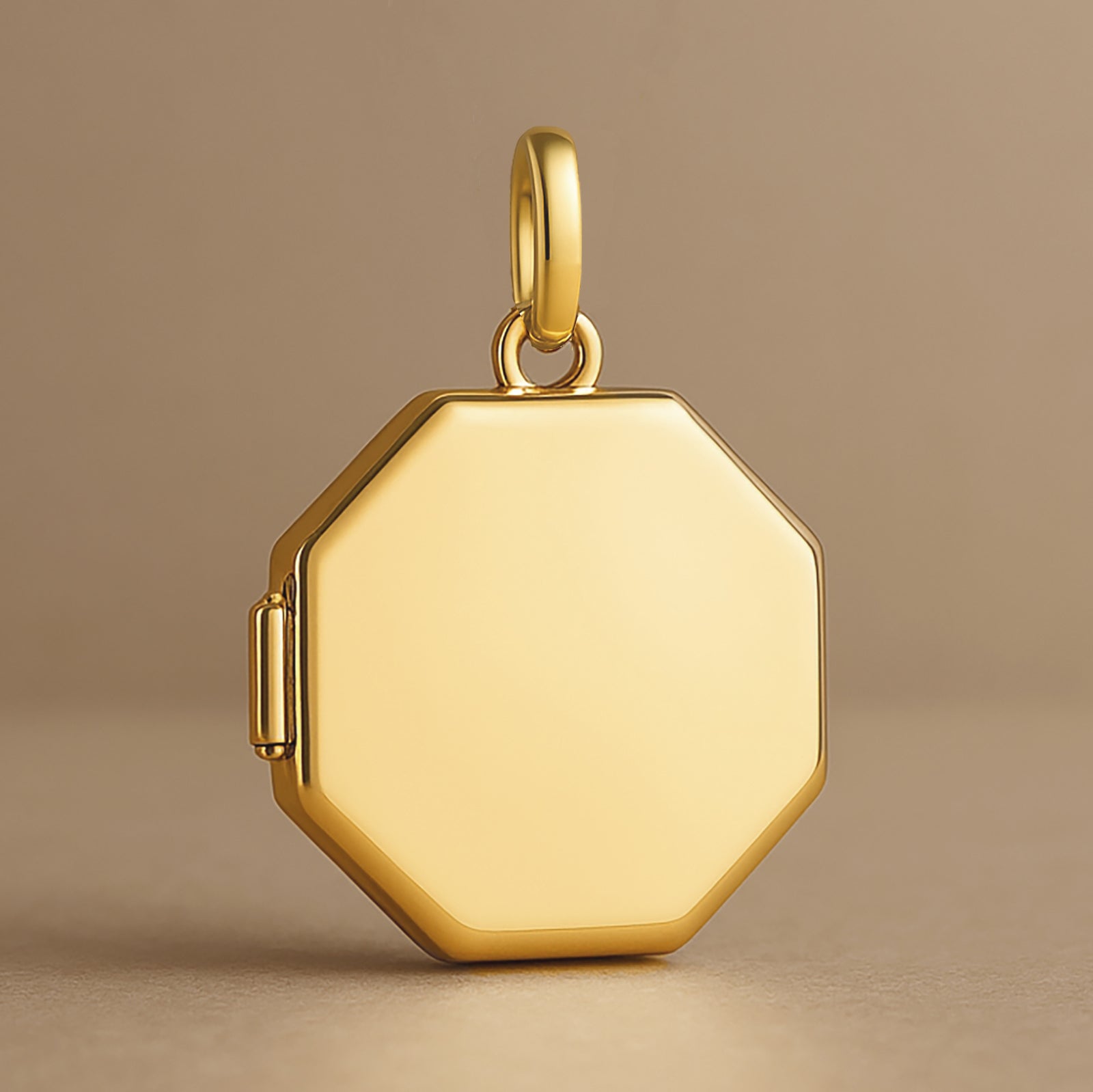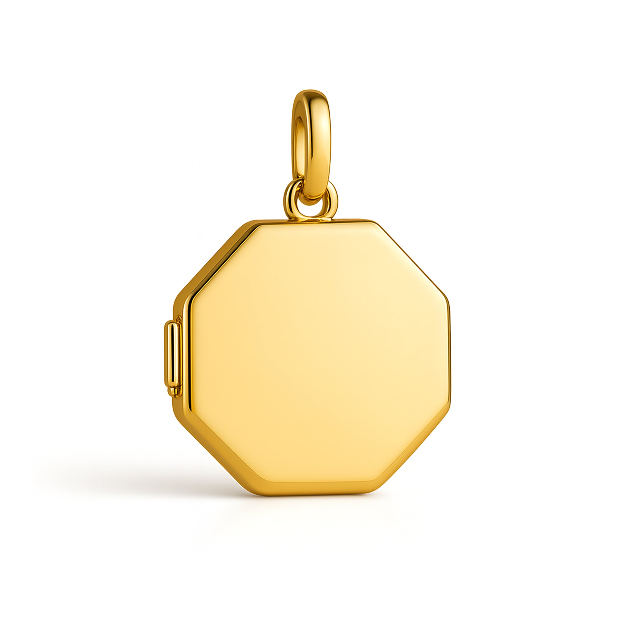 Capture special memories and carry them close with this sophisticated 14K solid gold octagonal locket. The unique eight-sided design offers a contemporary twist on a classic keepsake.