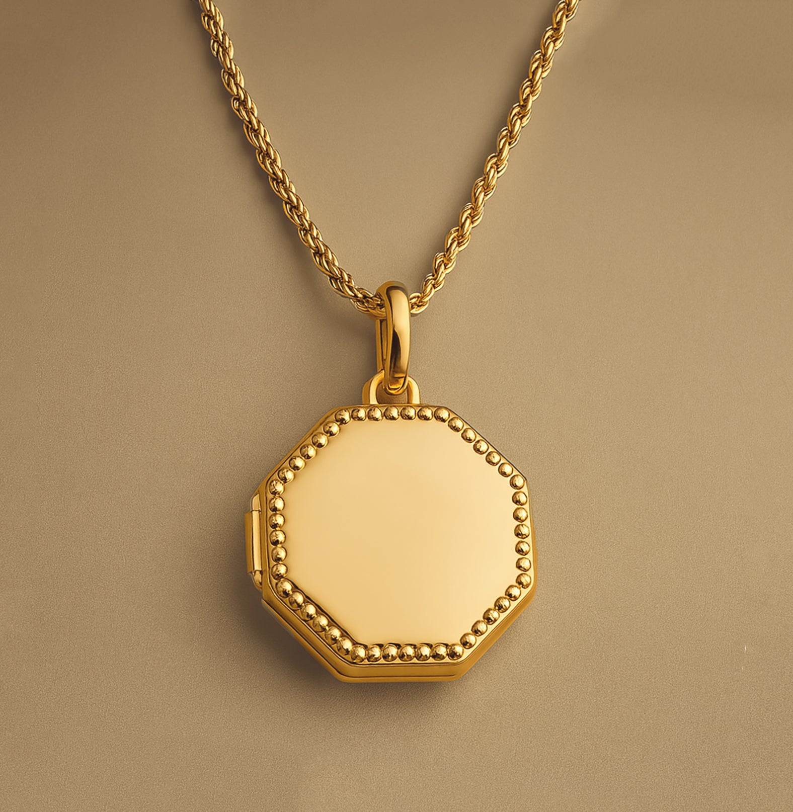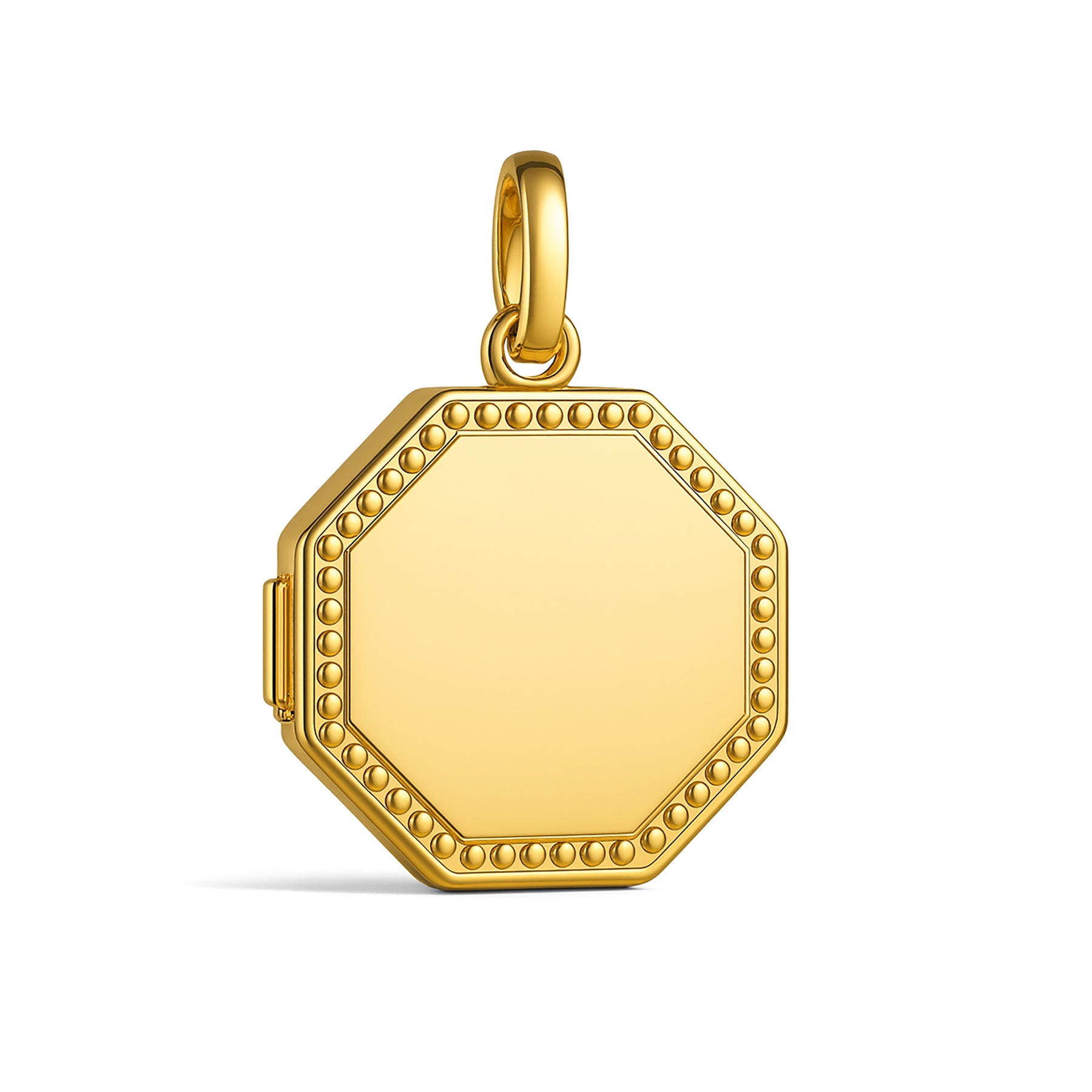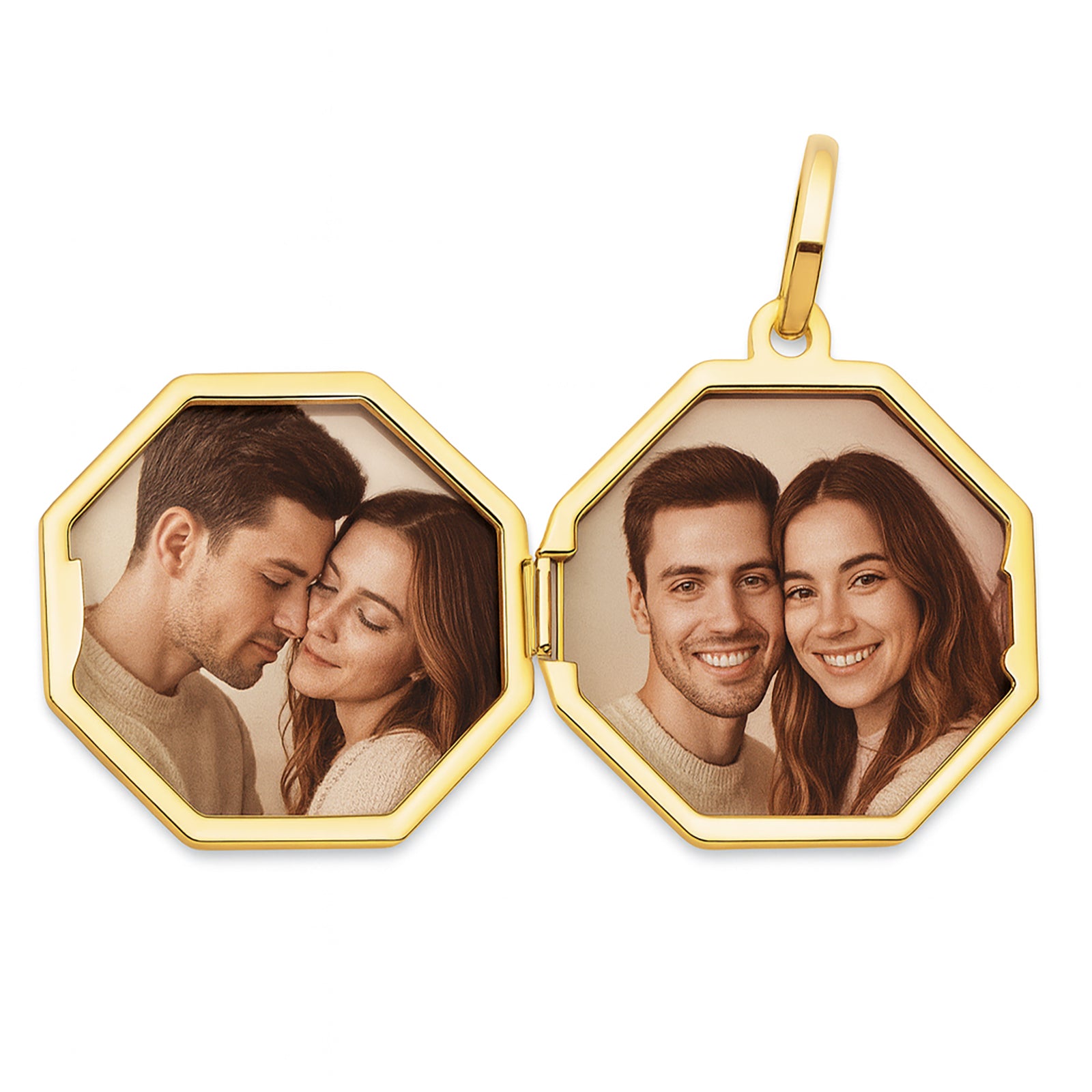 Capture special memories and carry them close with this sophisticated 14K solid gold octagonal locket. The unique eight-sided design offers a contemporary twist on a classic keepsake.