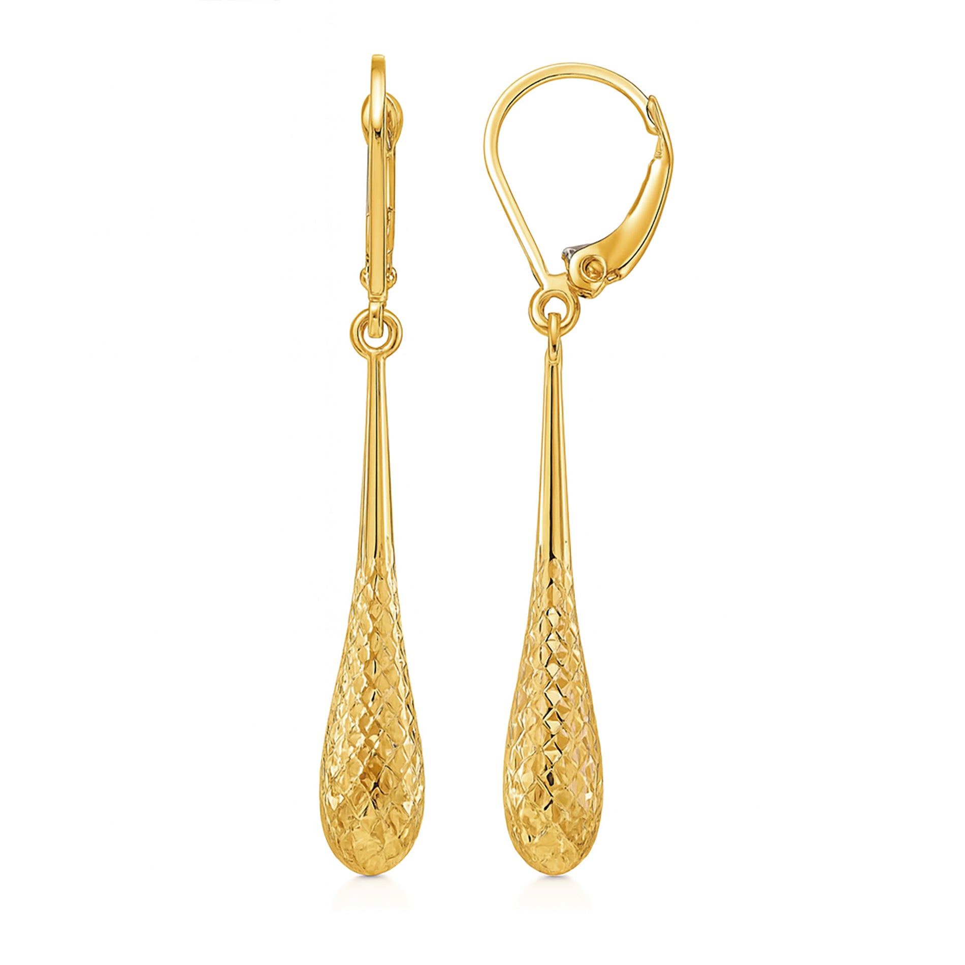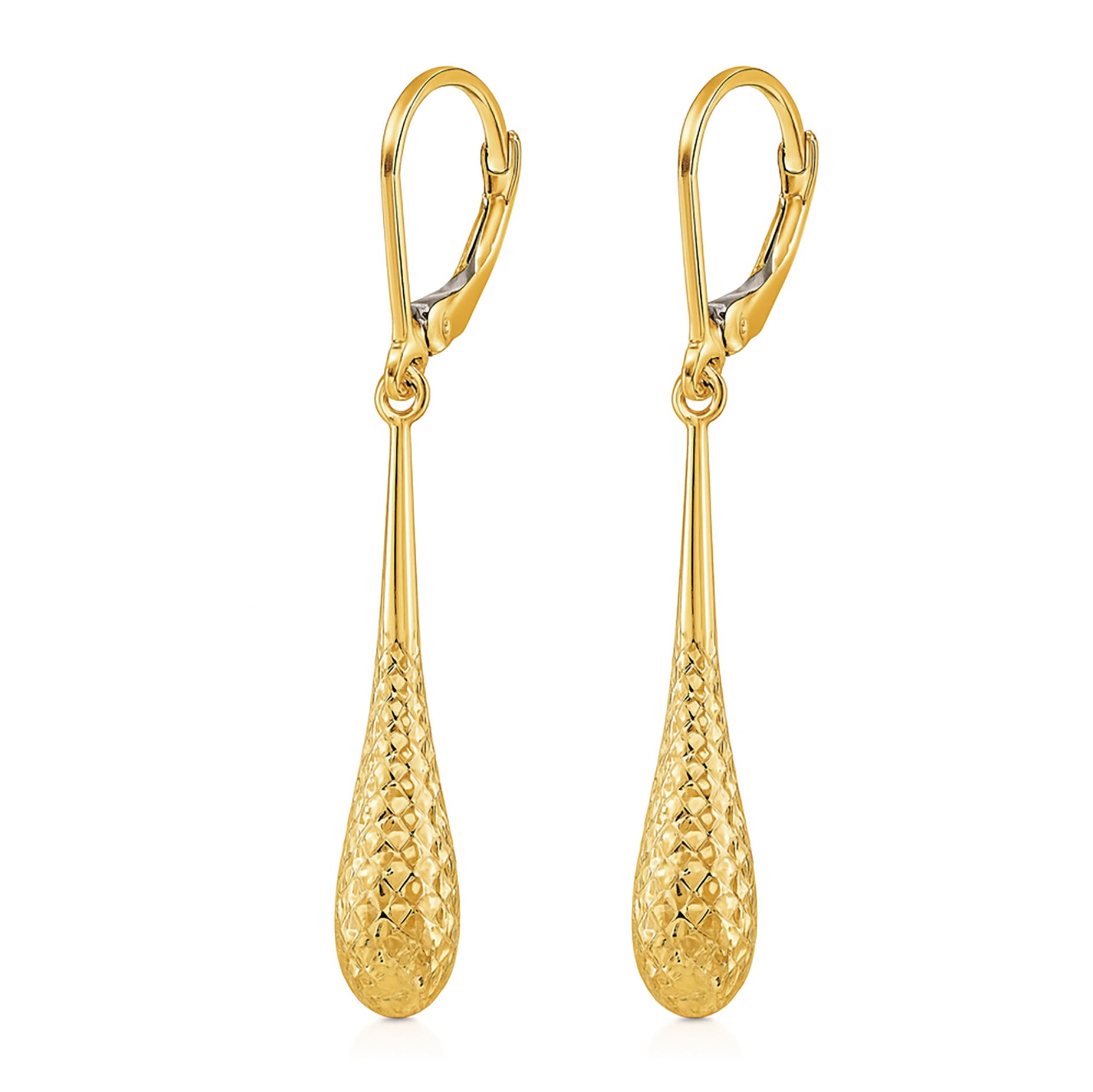 Elevate your look with the radiant brilliance of these 14K Solid Gold Diamond-Cut Teardrop Dangle Earrings — a breathtaking blend of timeless elegance and modern sophistication. Expertly crafted, each earring features a sculpted teardrop silhouette with a high-precision diamond-cut texture that catches and reflects light from every angle.