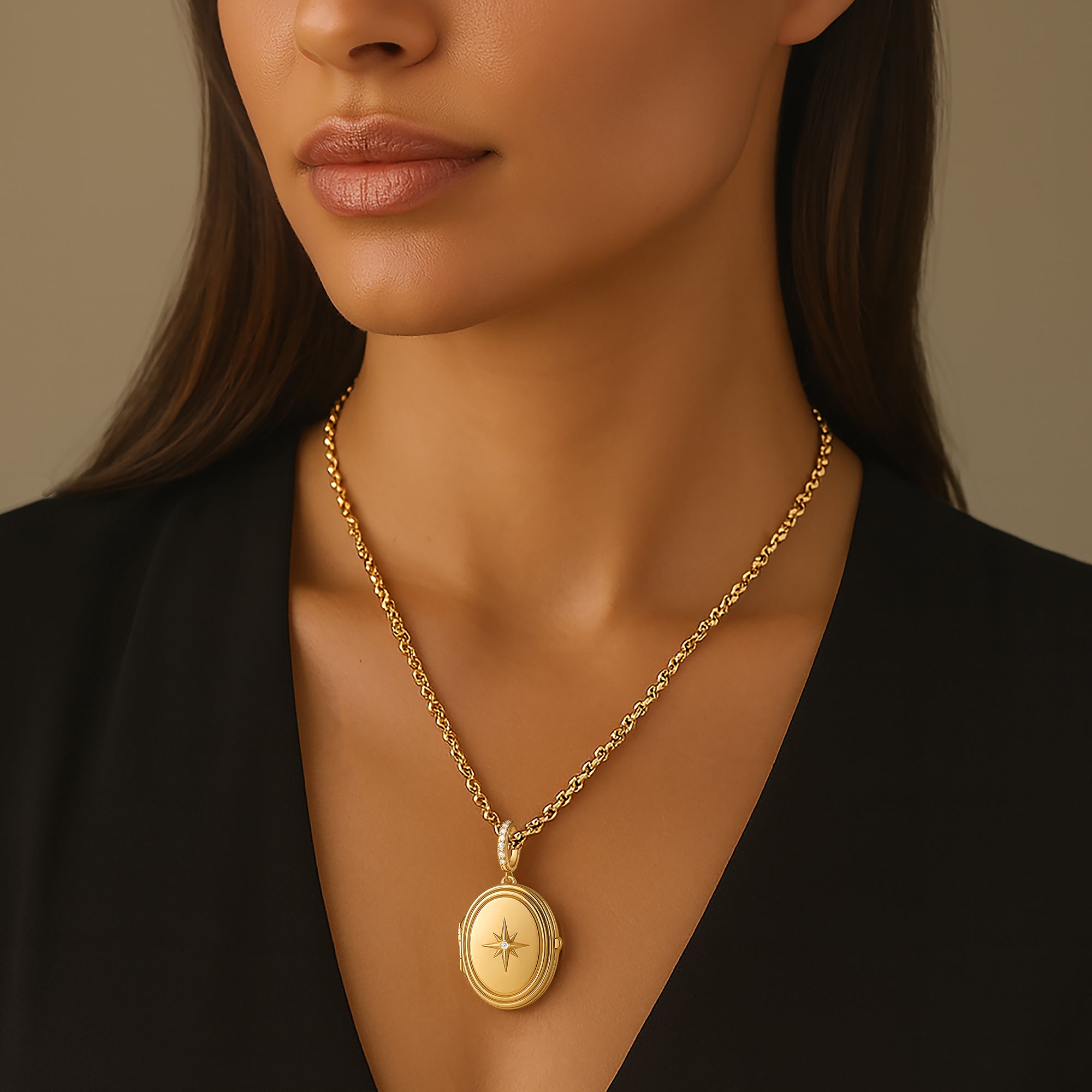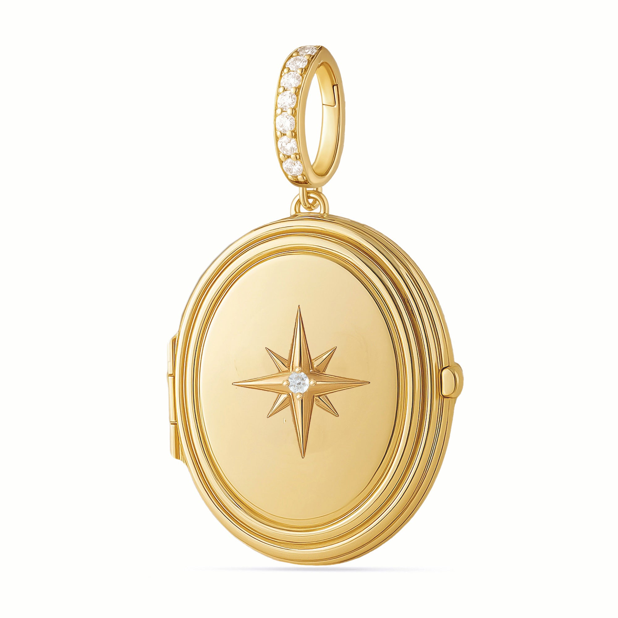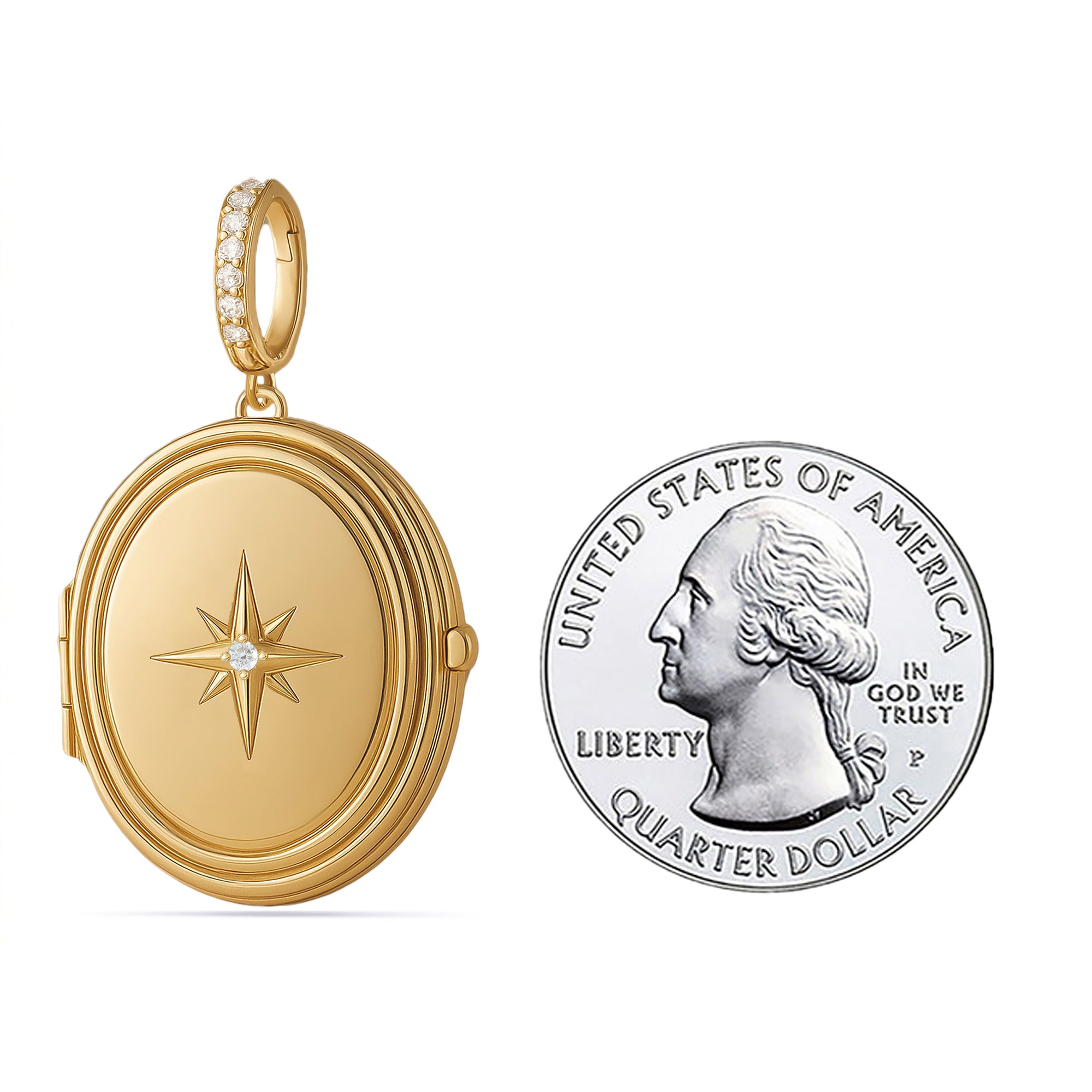 14K Solid Gold Diamond North Star Oval Locket Necklace with Diamond Enhancer Bail