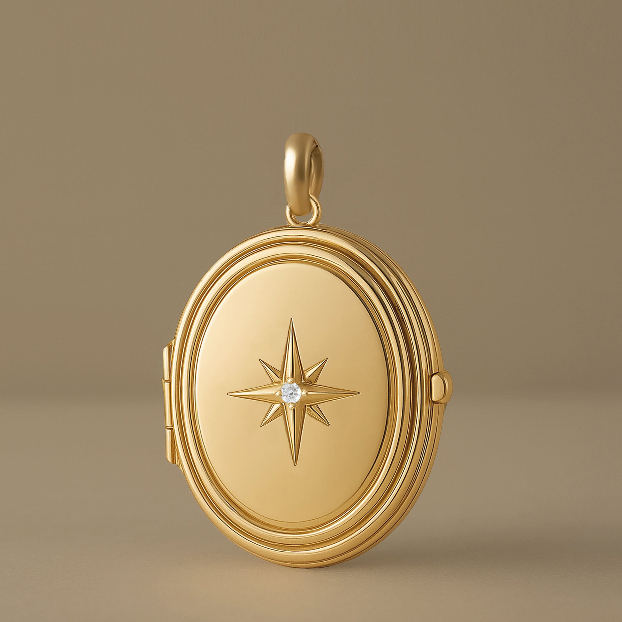 This exquisite 14K solid gold oval North Star locket is a timeless symbol of individuality and elegance. Handcrafted to order, it features a raised North Star motif adorned with natural diamonds, adding celestial sparkle to its polished gold surface.