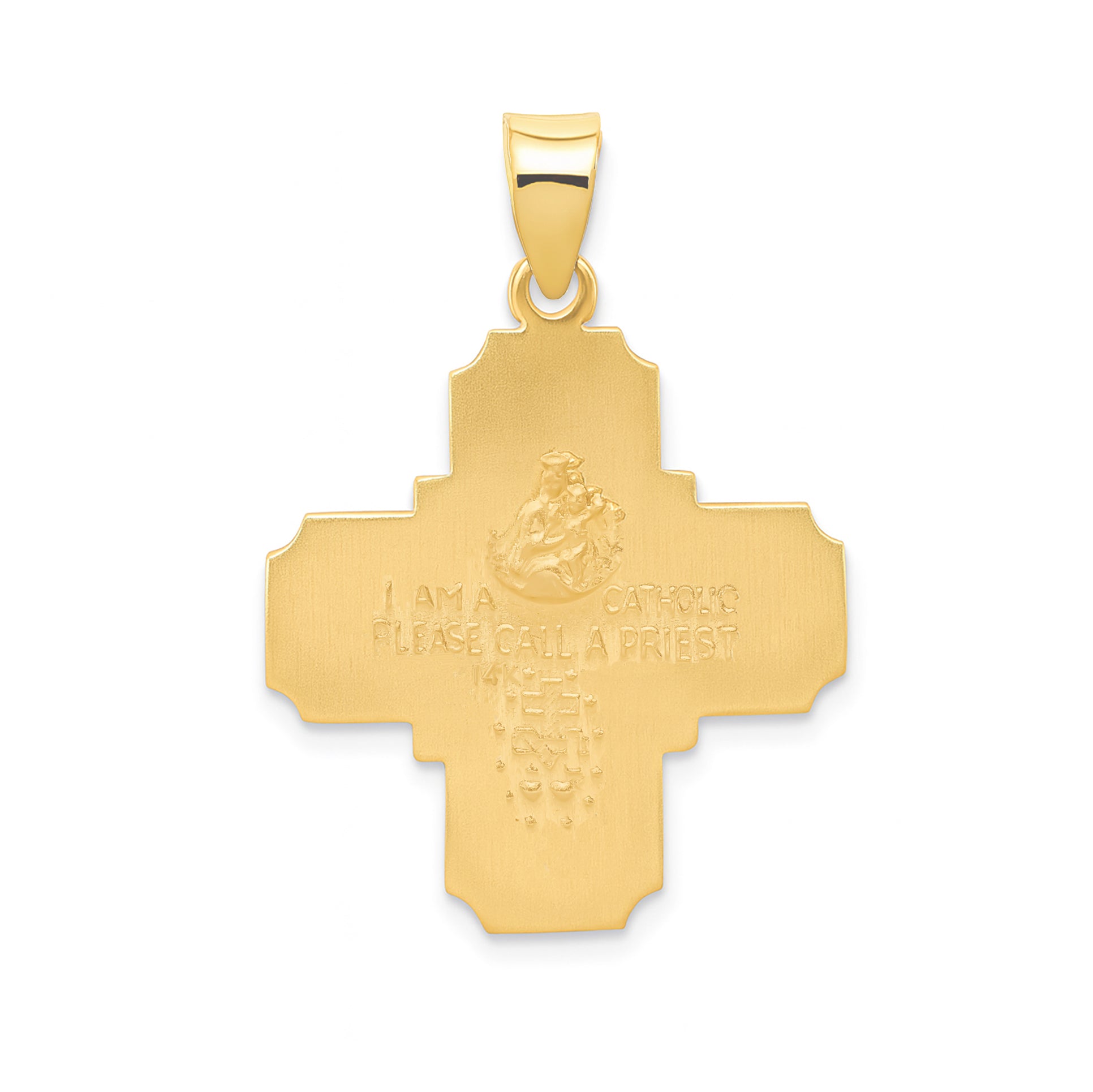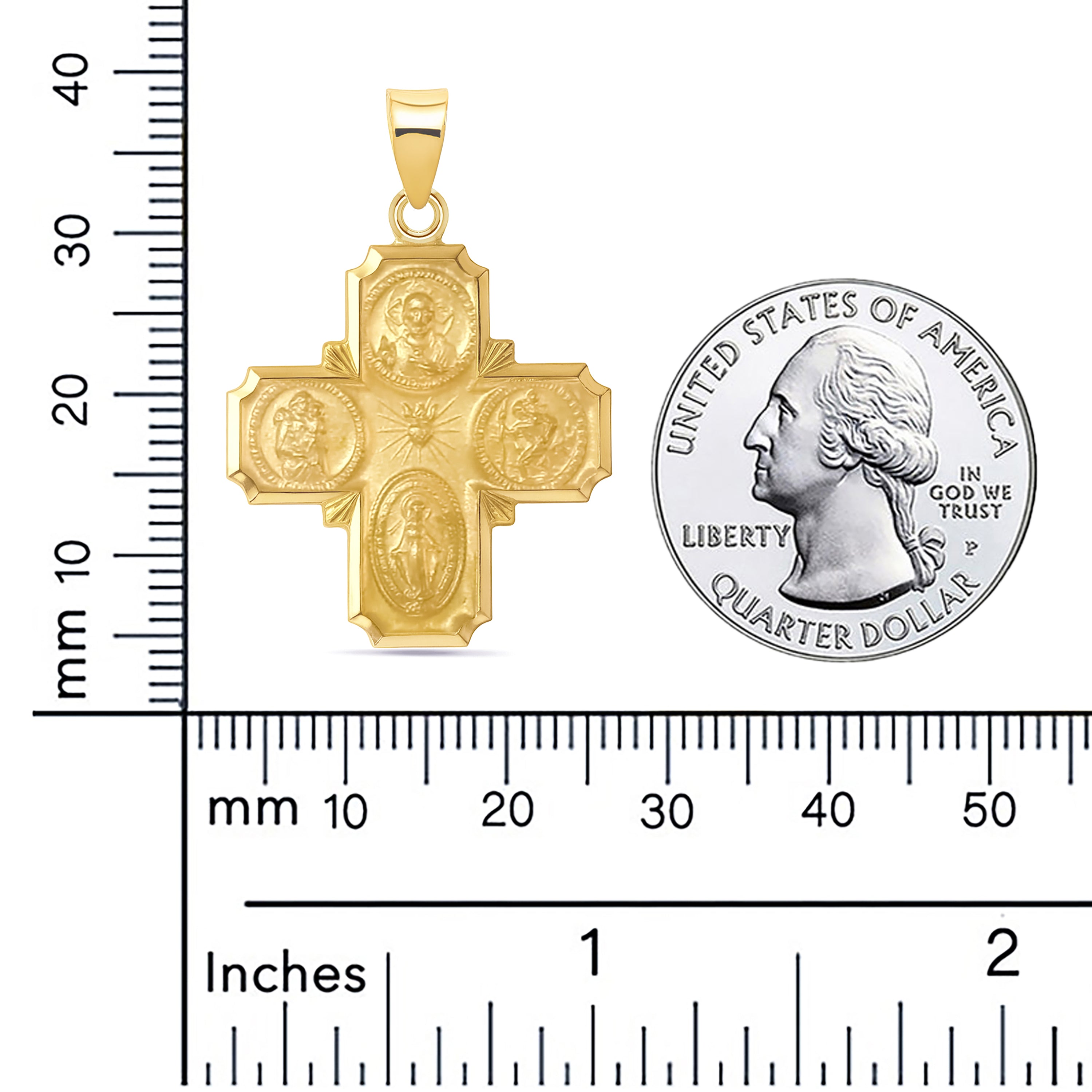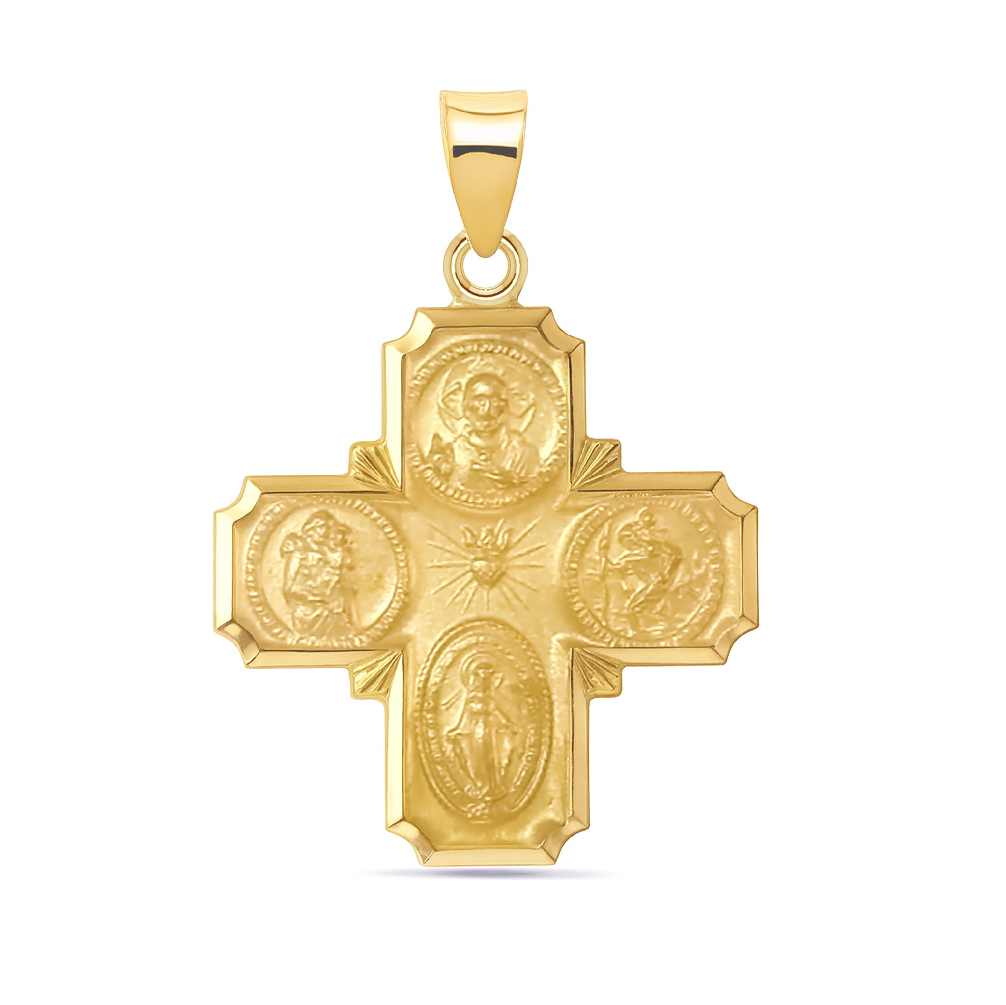 Honor your faith with this beautifully detailed 14K Gold Four-Way Cross Pendant, a timeless Catholic medal cherished for generations. Expertly crafted in solid 14K gold, this pendant features four beloved icons: Sacred Heart of Jesus, St. Christopher, St. Joseph, and Our Lady of the Miraculous Medal, centered around the radiant Holy Spirit. Each element is precisely engraved, creating a meaningful piece rich in tradition, protection, and devotion.
