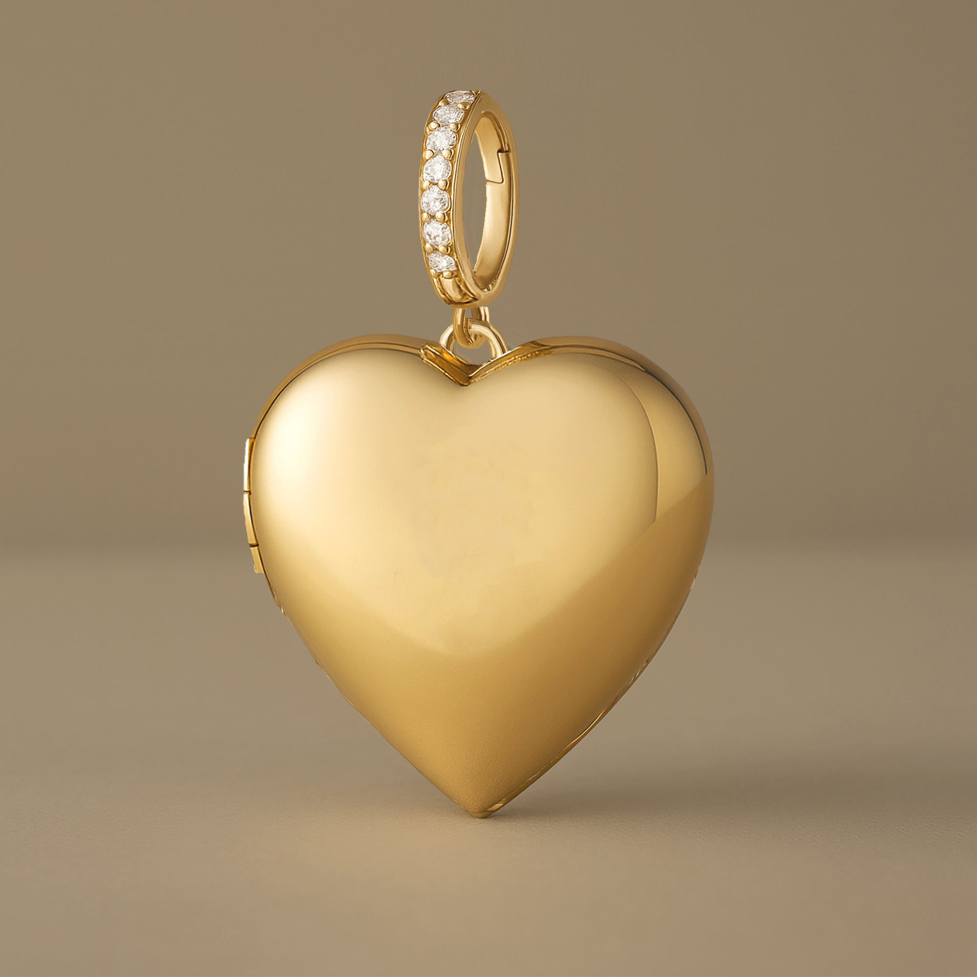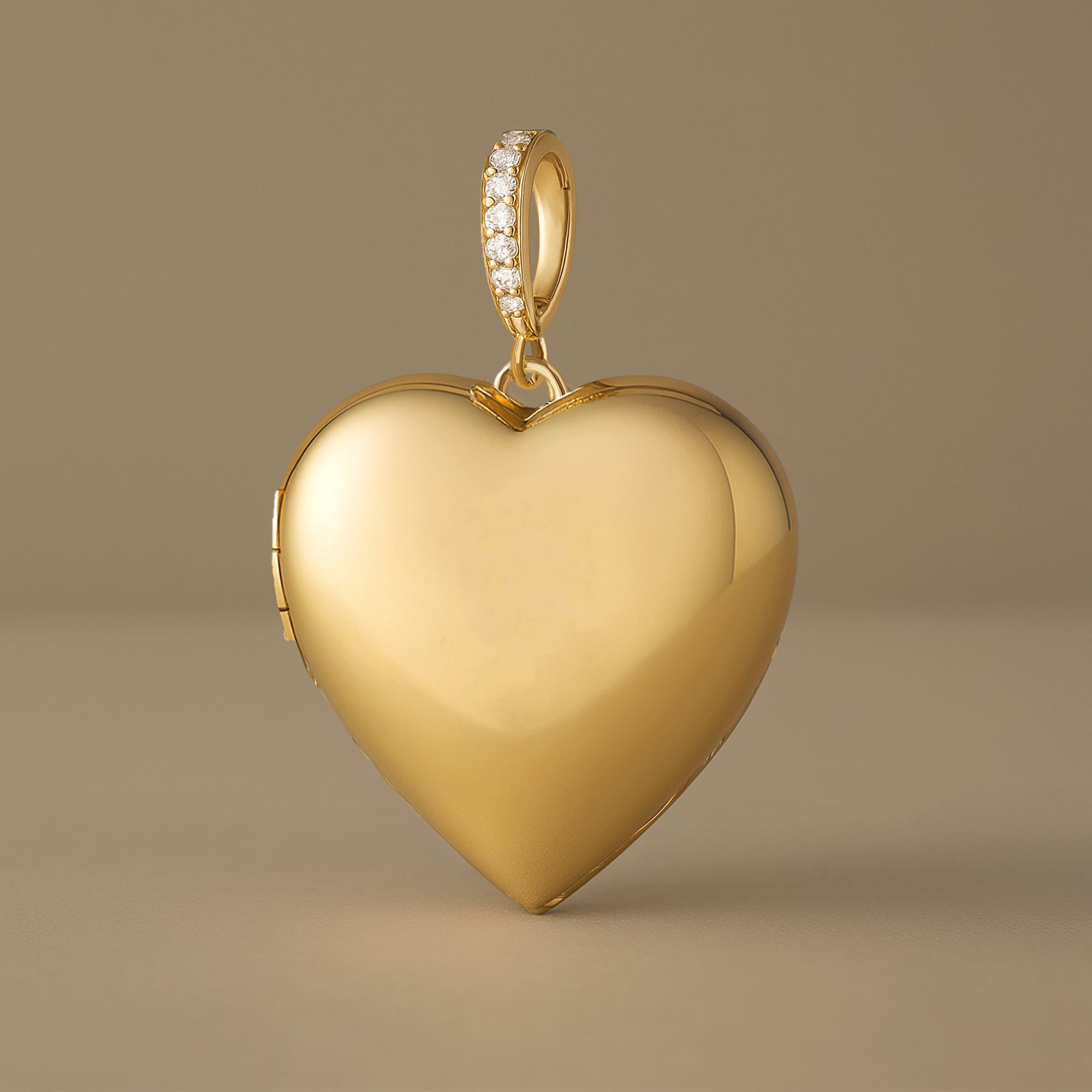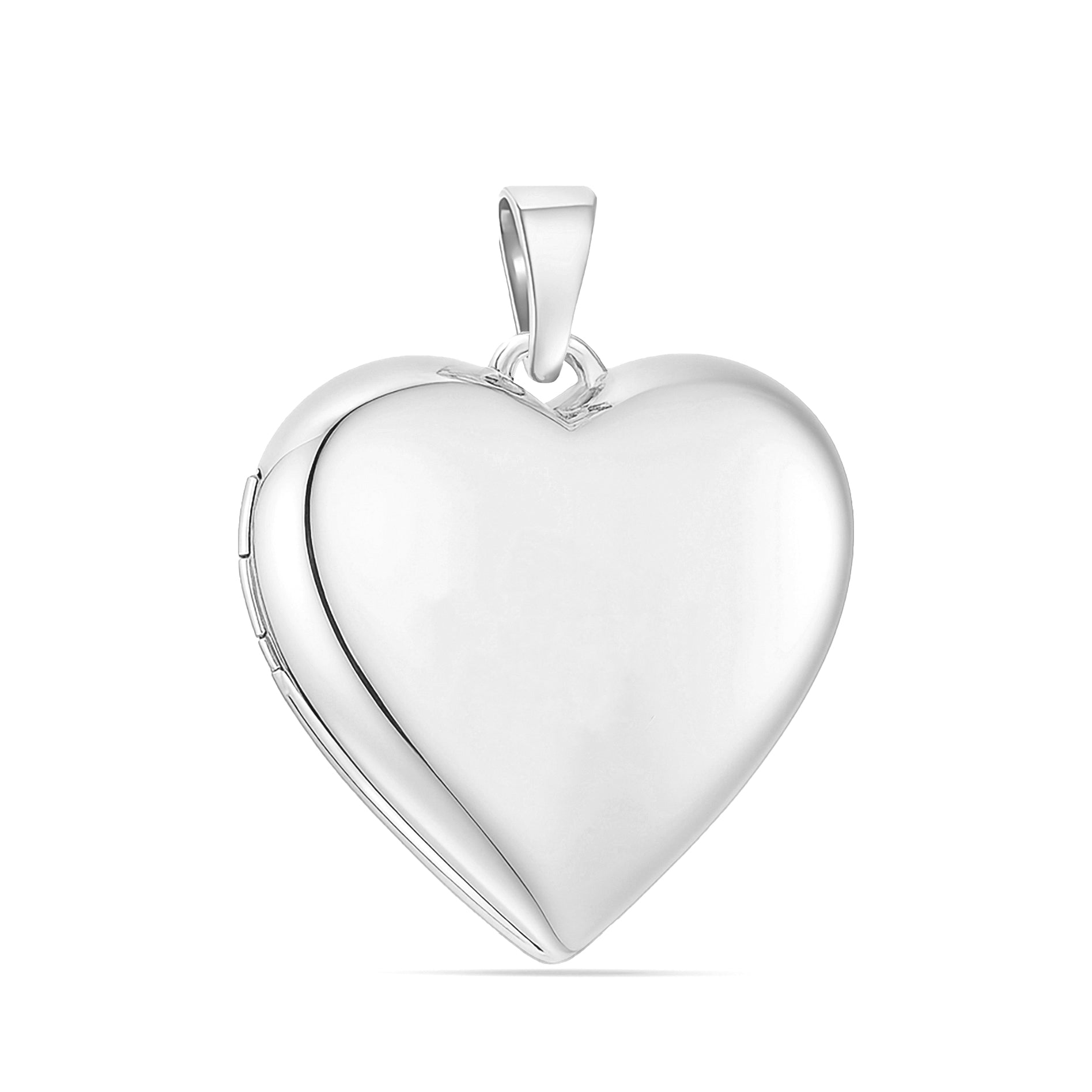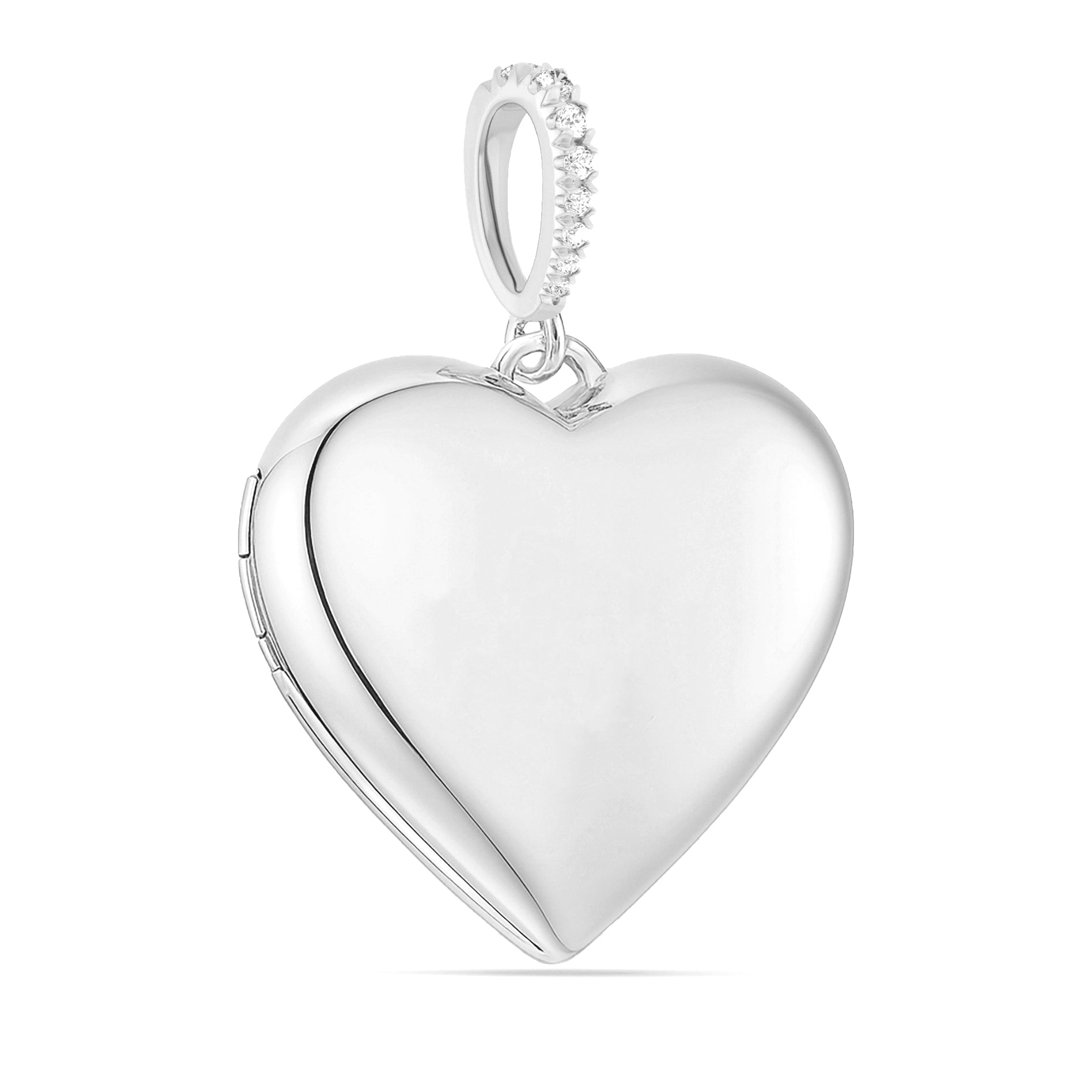 Choose from three bail options — a fixed diamond bail, a diamond enhancer bail that opens to fit multiple chains, or a classic plain bail for a sleek, minimalist look. The locket opens to hold two photos or keepsakes, and the back can be engraved with initials, names, or a special message, creating a truly personal heirloom.