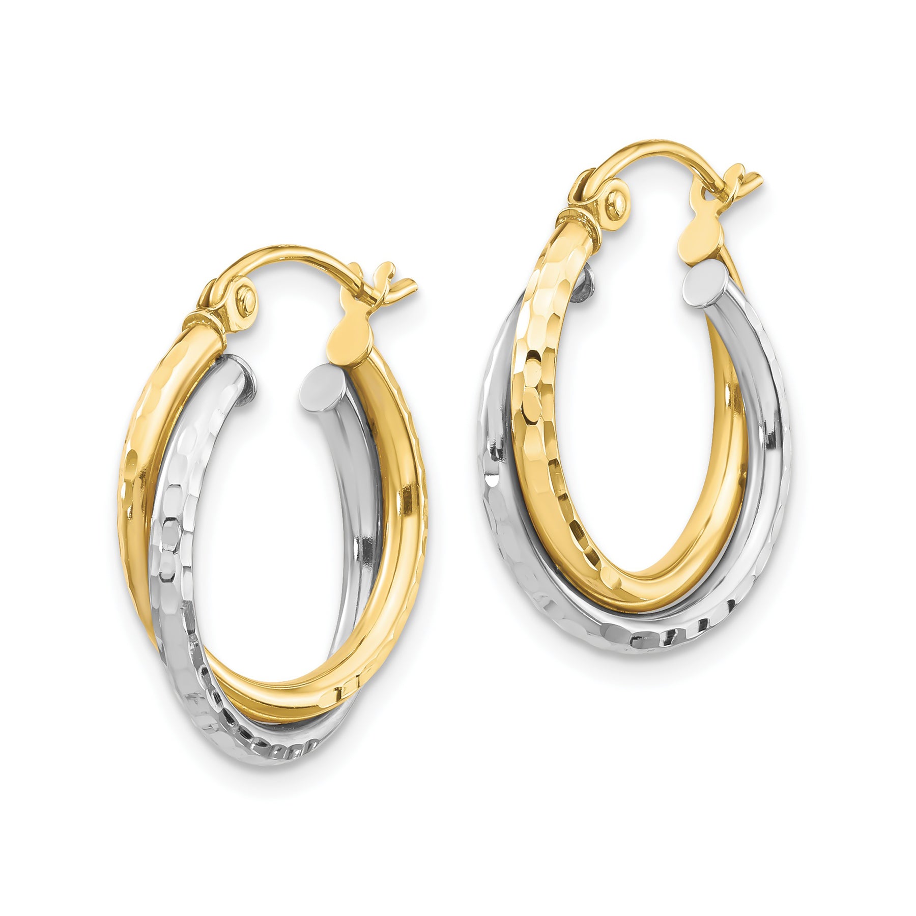 Expertly made from genuine 10K solid gold, these earrings feature a hammered finish that enhances their rich gold tones and luxurious shine. The two-tone design allows them to pair effortlessly with both yellow and white gold jewelry, making them a must-have staple in any fine jewelry collection.