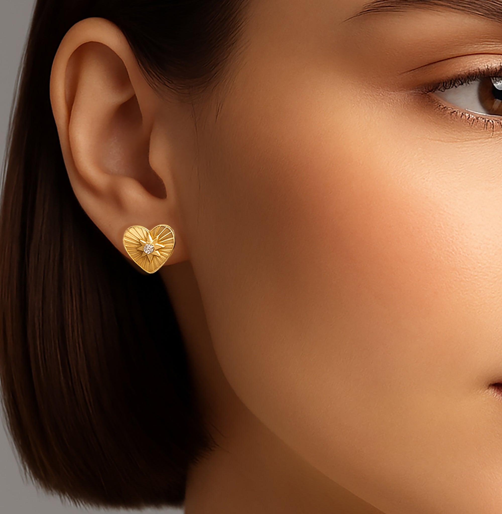 Illuminate your look with these exquisite 14K solid gold fluted heart stud earrings, featuring a radiant North Star design accented with premium cubic zirconia. Each earring is meticulously crafted to capture light beautifully, with a soft fluted texture that enhances the natural brilliance of solid gold.