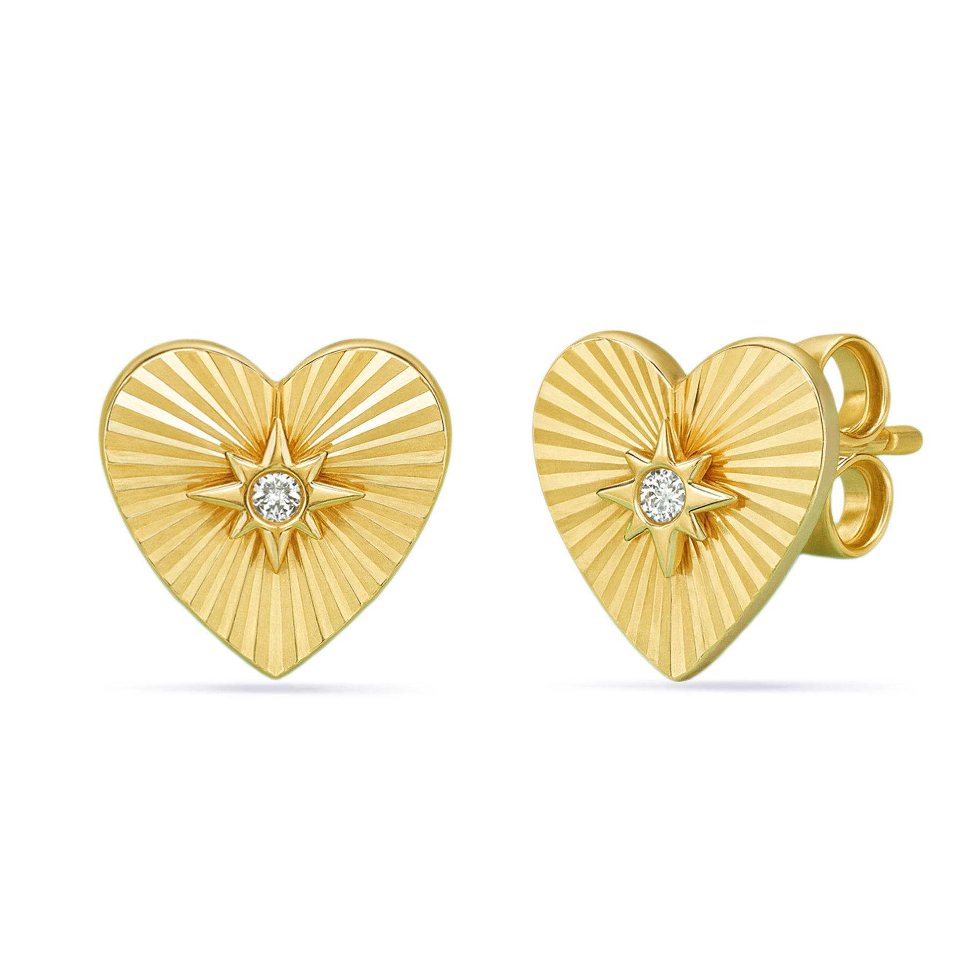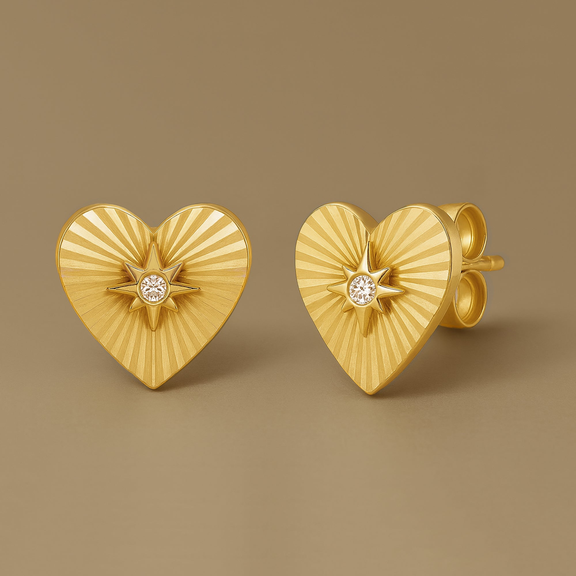 Heartburst Earrings 14K Solid Gold Fluted Heart Stud Earrings with North Star Accent