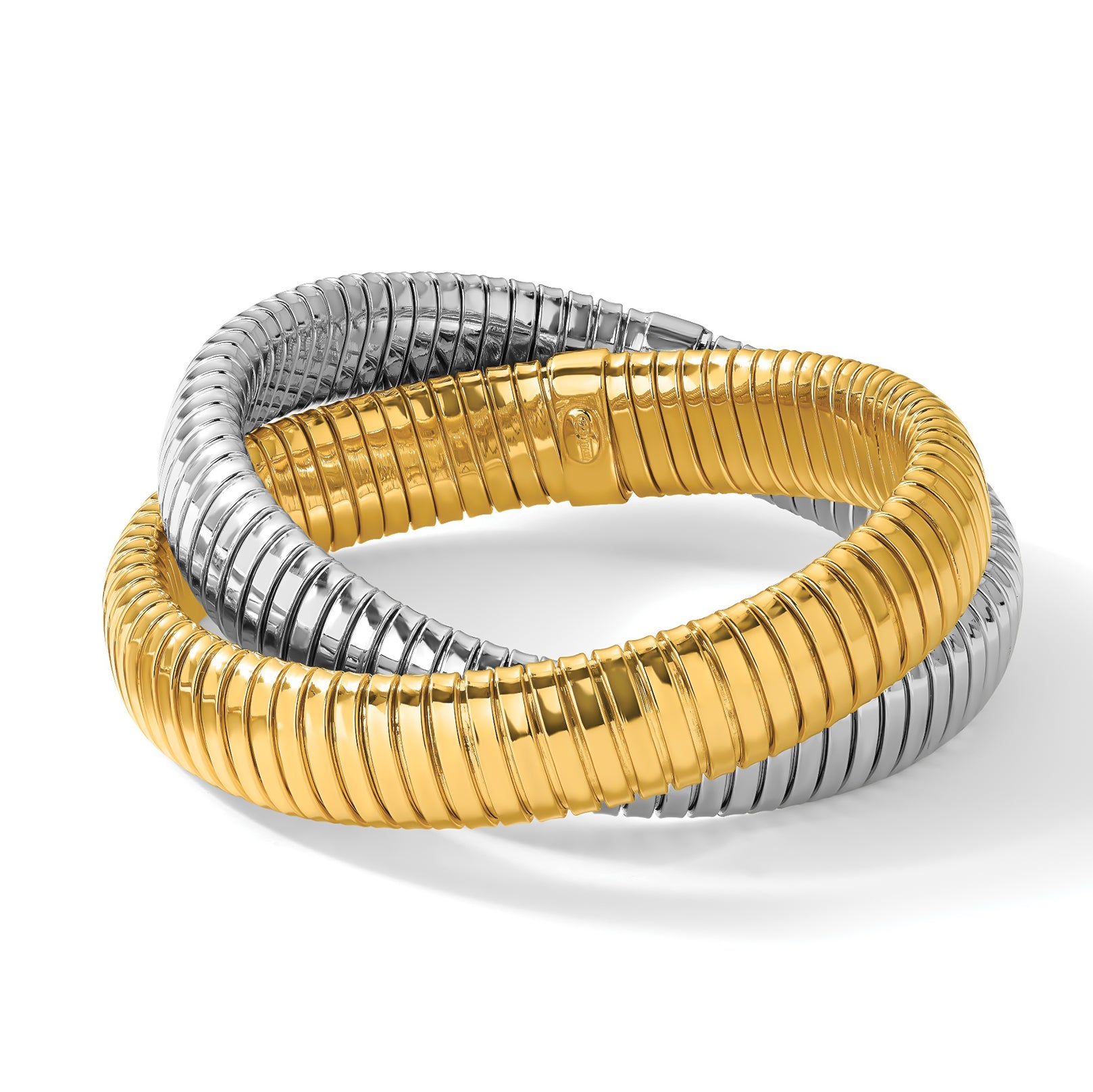 The double-layered coil design blends modern Italian sophistication with timeless jewelry craftsmanship. Its flexible construction requires no clasp, allowing it to slide on easily while maintaining its secure, structured shape.
